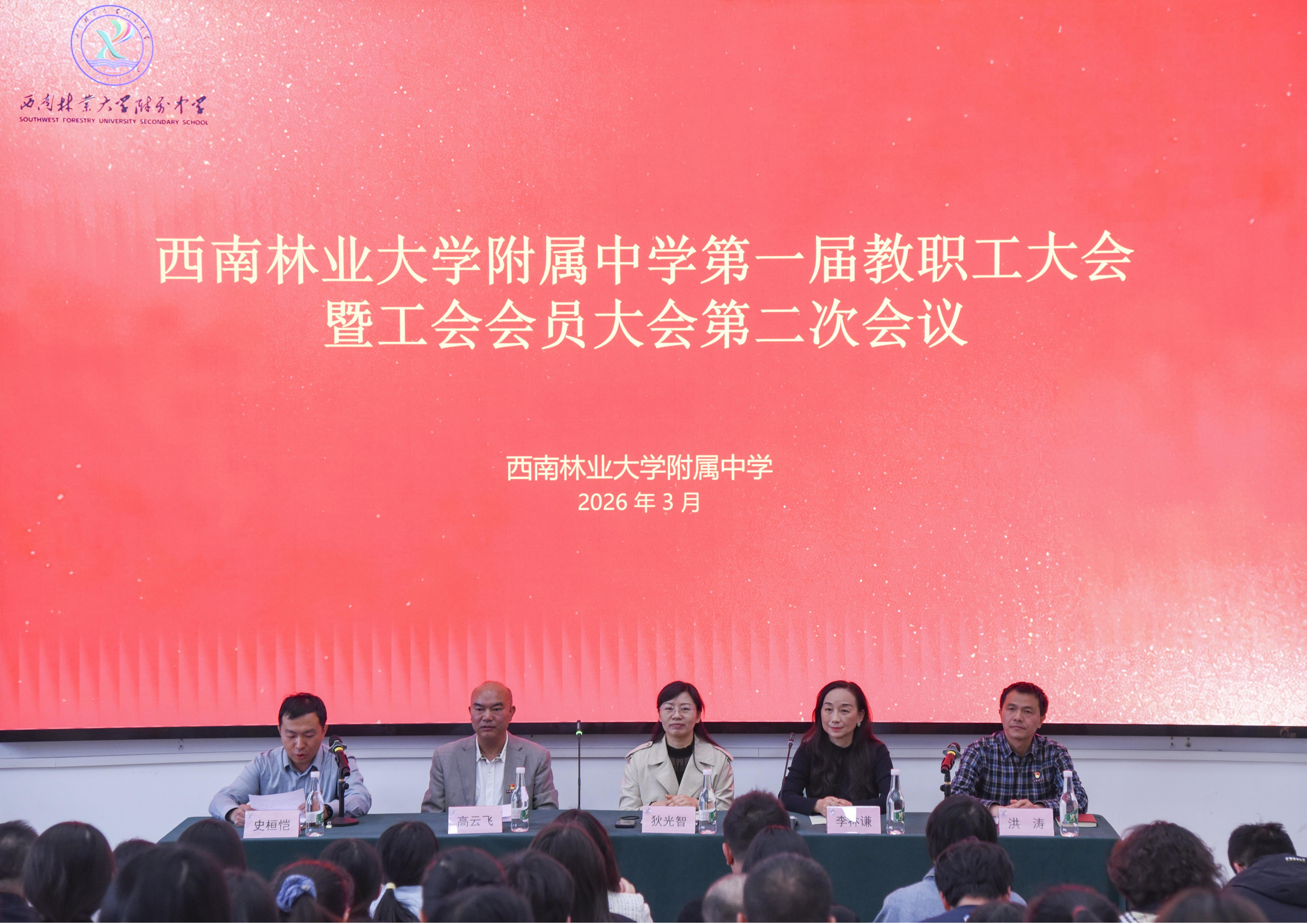 2026年3月31日下午,西南林业大学附属中学(云大附中西林学校,以下简称“西林附中”)召开了第一届教职工大会暨工会会员大会第二次会议。西南林业大学副校长狄光智,校工会副主席李林谦出席并讲话,西林附中直属党支部书记、校长高云飞,副校长洪涛及全体教职工参加会议。大会由党支部副书记史桓恺主持。