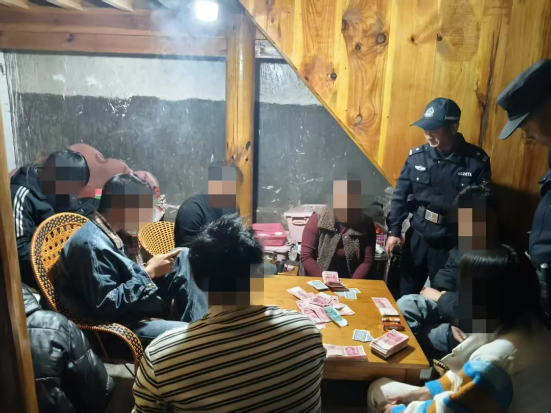 烟雾缭绕的房间里,一张方桌堆满了百元大钞和扑克牌,几名男子正围坐桌前,双眼紧盯着手中的牌,浑然不知民警已悄然逼近……