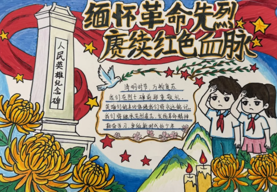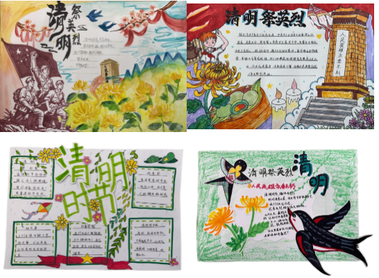 本次活动以3月25日至4月2日为活动周期,结合各年级学生特点,精心设计了三大特色活动。1至3年级聚焦清明节传统文化与英烈精神,开展“清明祭英烈”手抄报征集,孩子们以画笔为媒、以文字为情,精心创作图文并茂的作品,将对英烈的追思与传统文化的理解融入笔尖,每一幅作品都饱含着赤诚的家国情怀。