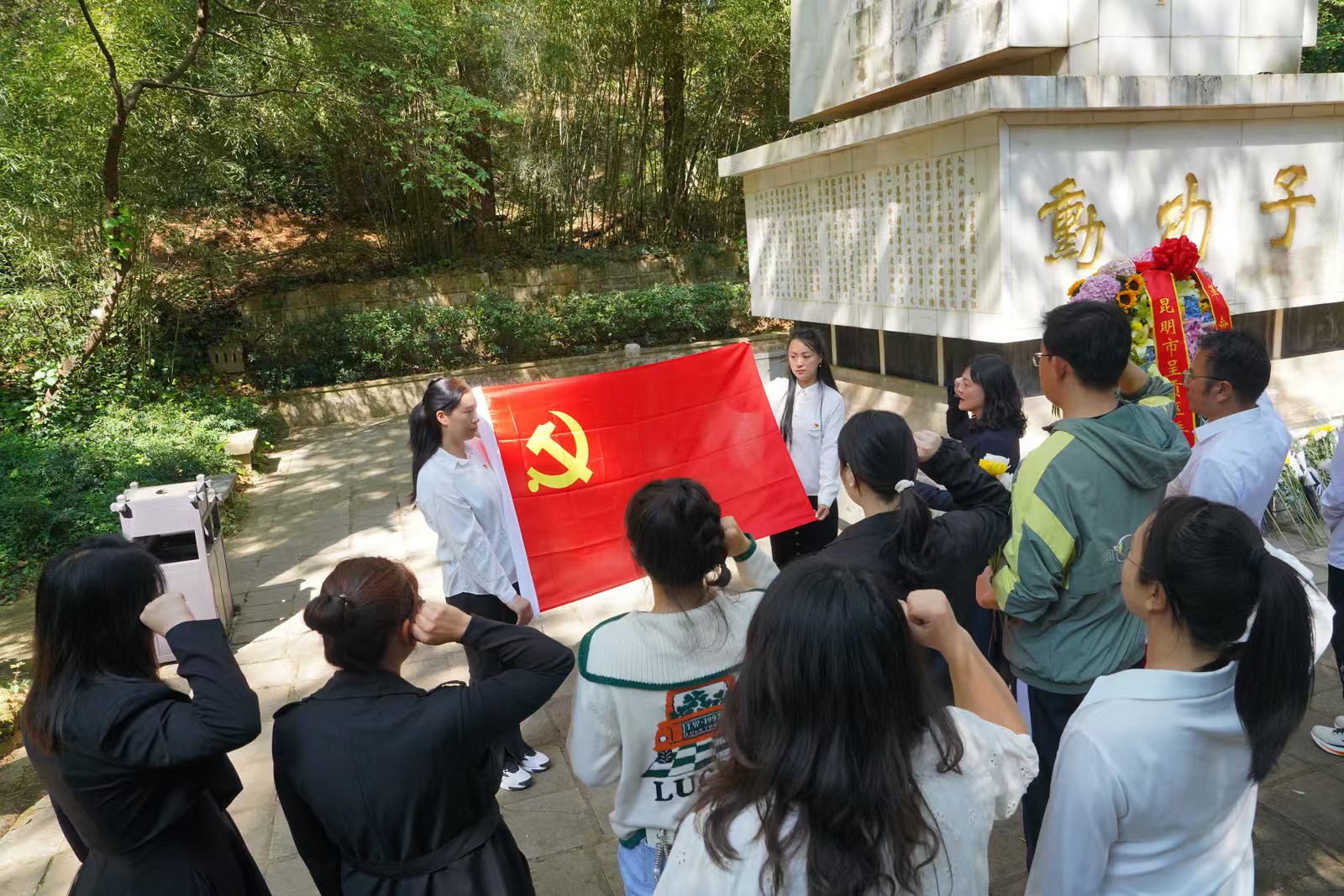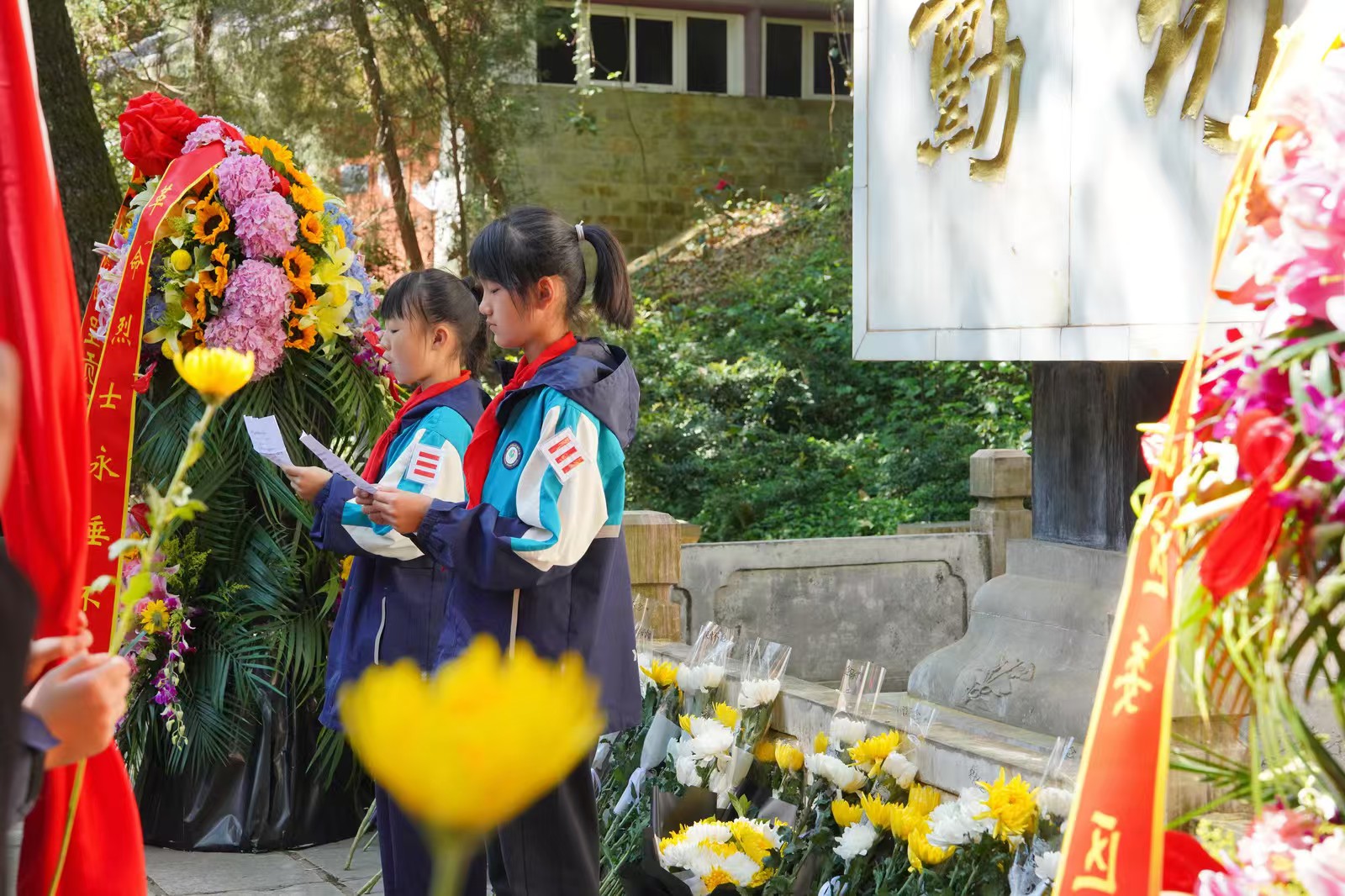 党员、团员、少先队员依次重温誓词,铮铮誓言彰显传承英烈精神的坚定决心。随后,全体人员向英烈敬献鲜花,用沾湿的毛巾,小心翼翼擦拭英明录上的灰尘,表达深切缅怀与崇敬。