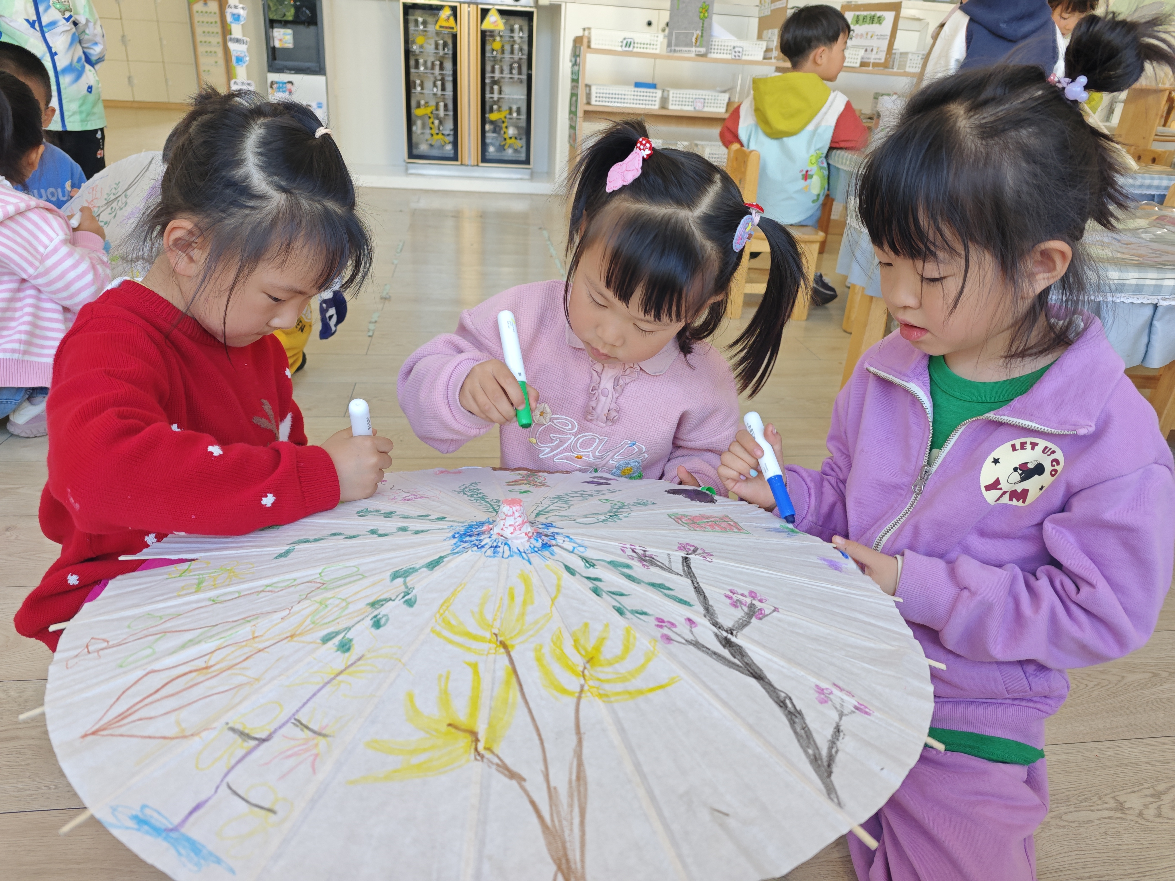中班以传统手工艺为媒,尽显国风浪漫。孩子们以传统手工艺为载体,尽显国风浪漫。巧手制作纸鸢,用彩线与画笔放飞心愿;同步开展“伞绘清明”活动,在油纸伞上勾勒节气元素,于指尖创作中感受非遗之美,让传统文化在童心扎根。