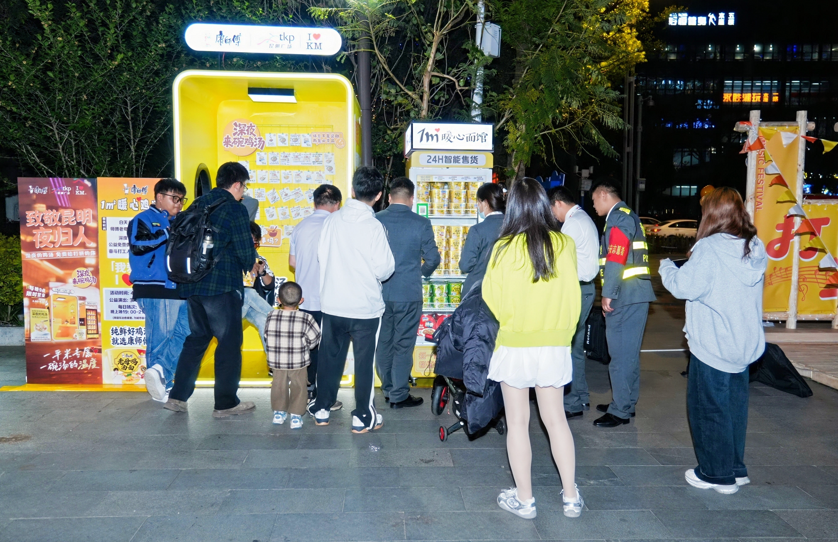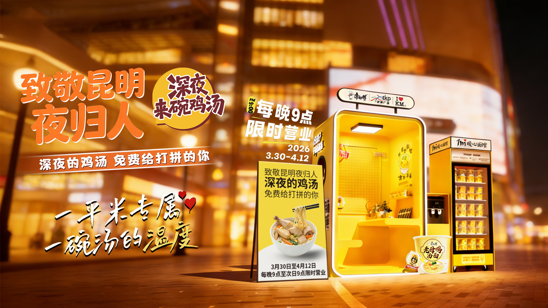 4月3日起至4月12日,每晚22时至次日凌晨,昆明同德广场设立“1平米暖心面馆”,为深夜仍在街头奔波的代驾小哥、加班族、末班公交乘客等群体免费提供康师傅老母鸡汤面。活动还配套举办“打工人音乐会”,以一碗热面和一首歌,向昆明夜归人致敬。