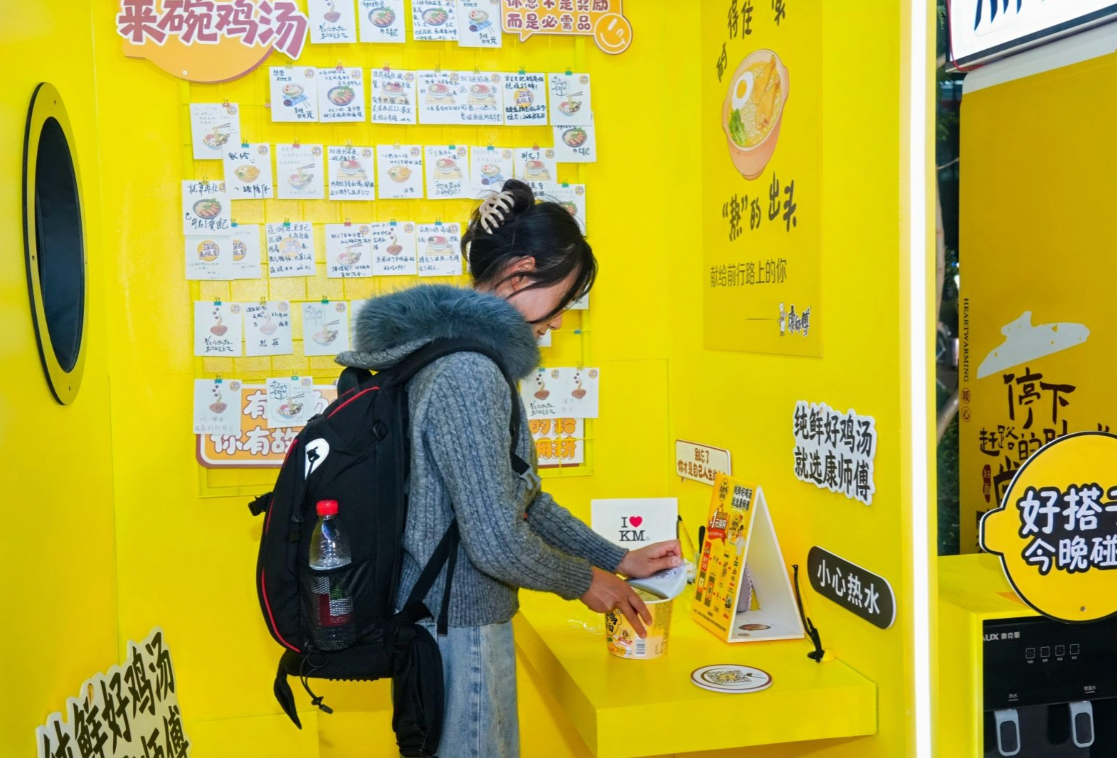 近日,不少深夜路过昆明同德广场的市民发现,广场一角出现了一个仅一平方米大小的“暖心面馆”。没有收银台,没有菜单,只有一张煮面台和墙上几句手写的话:“深夜来碗鸡汤”“胃暖了,心就没有那么空”。这是康师傅联合同德广场共同策划的公益活动,旨在为城市中深夜赶路的人提供一处免费的温暖补给。