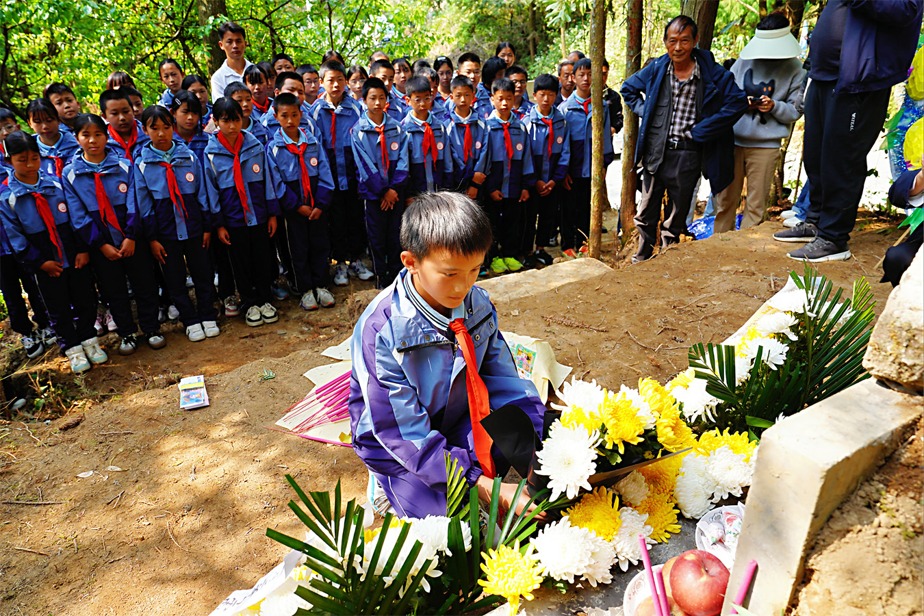 蜿蜒石径旁,洁白花圈静静摆放;苍松翠柏间,肃穆墓园焕然一新。4月3日,腾冲市芒棒镇上营村山林深处,一场简朴而庄重的祭扫仪式正在举行。来自当地党员干部、师生代表、社区群众依次上前,深深鞠躬,献上鲜花。孩子们眼中噙满泪水,默默聆听那段尘封了82年的英雄往事——这里,长眠着中国远征军第五十三军二等军需佐薛镒。