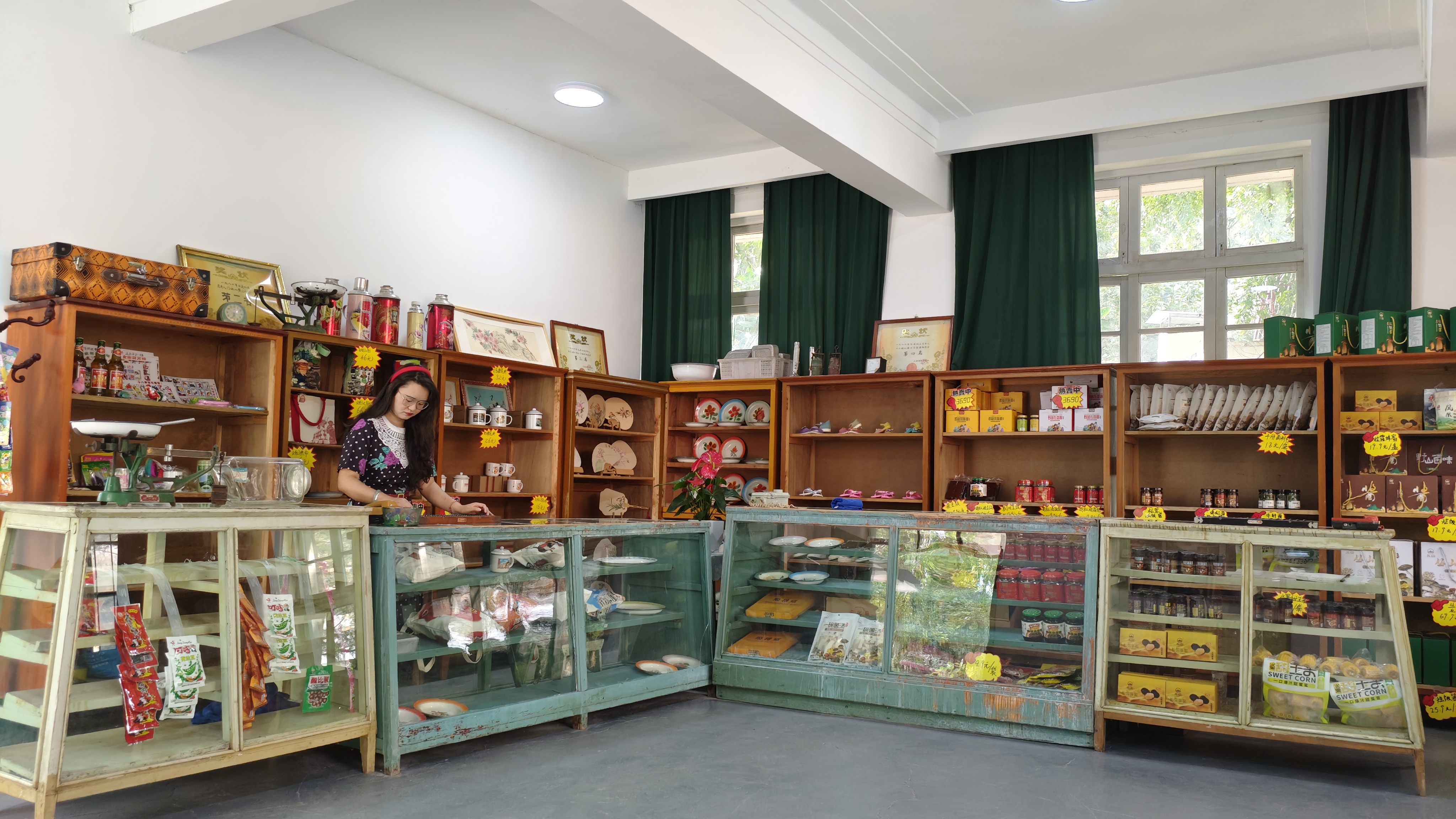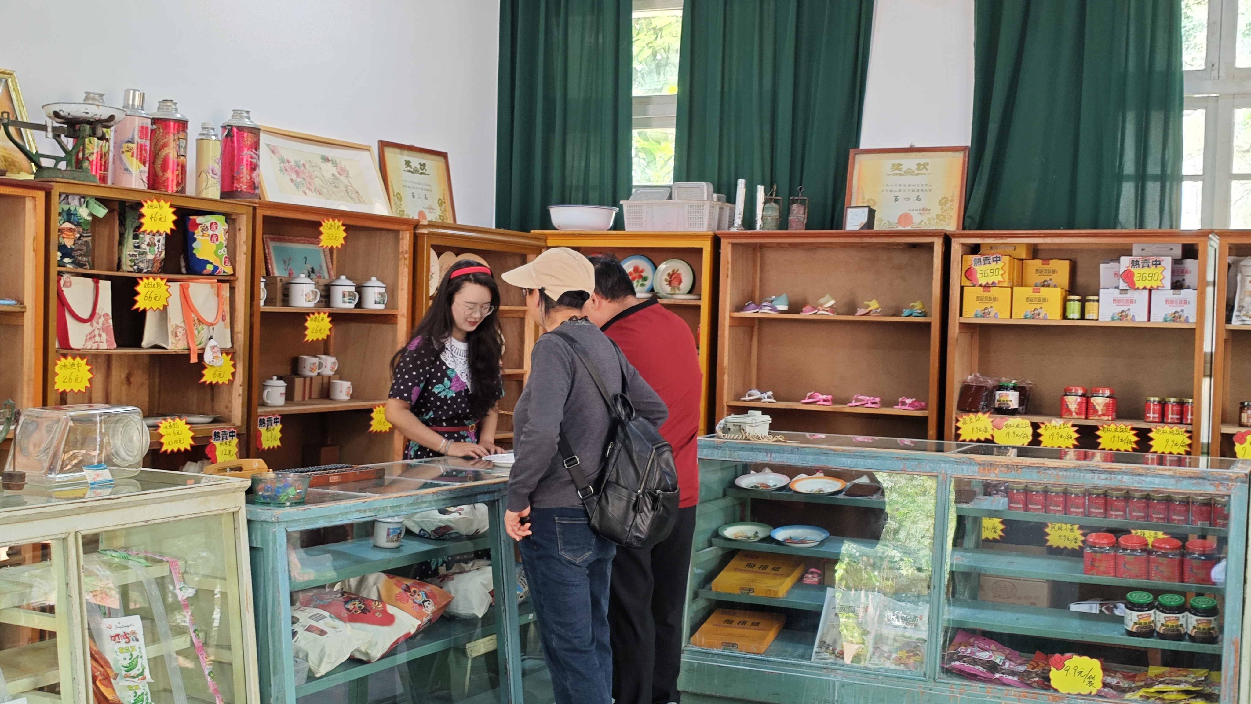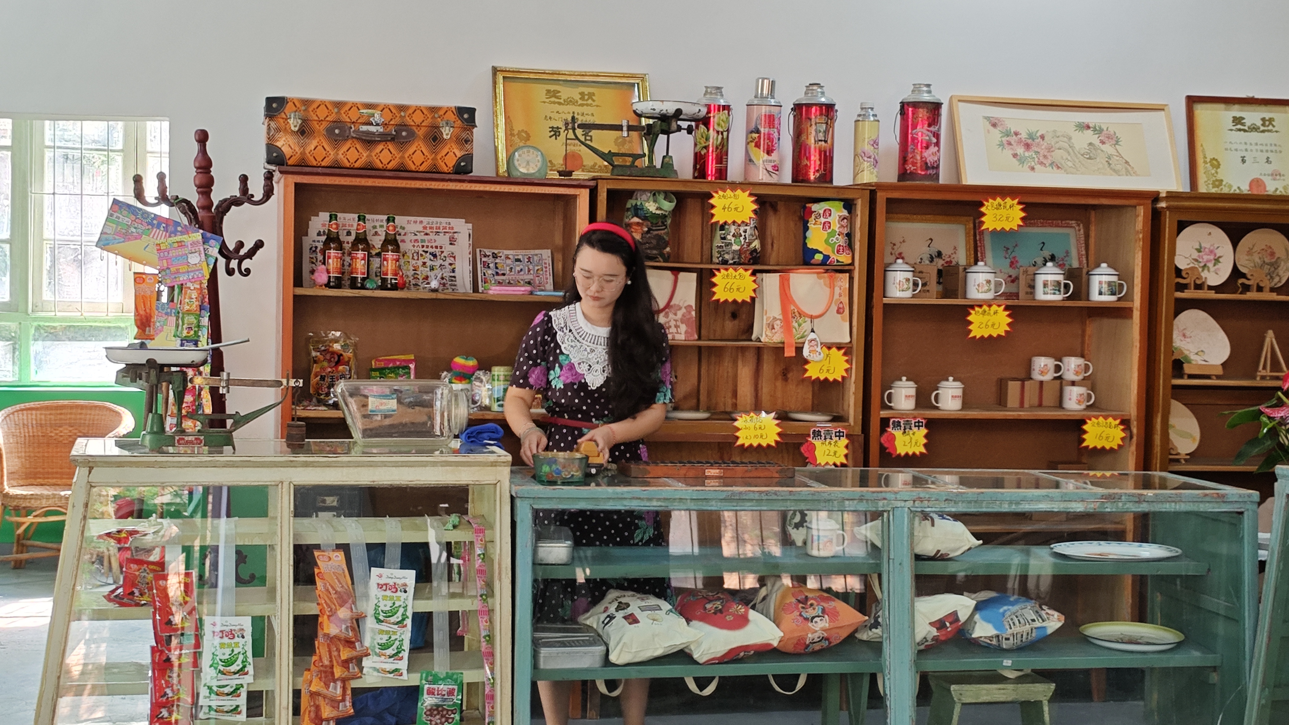 推开两扇斑驳的绿木门,仿佛一步踏入上世纪矿区生活区的日常,每一处细节,都诉说着这座工业小镇的烟火岁月。刷着旧漆的木质货架整齐排列,老式玻璃柜台温润雅致,柜台上那架黑色算盘静静摆放,似在等待被轻轻拨动。货架上,搪瓷杯、印着“为人民服务”的暖水瓶、印着老标语的帆布包依次陈列;墙上挂着泛黄的奖状与老海报,角落摆放着老式天平秤、旧钟表。柔和的光线透过木格窗洒下慵懒的光影,空气里仿佛还萦绕着当年矿区里油盐酱醋的烟火气,以及糖果零食的清甜。