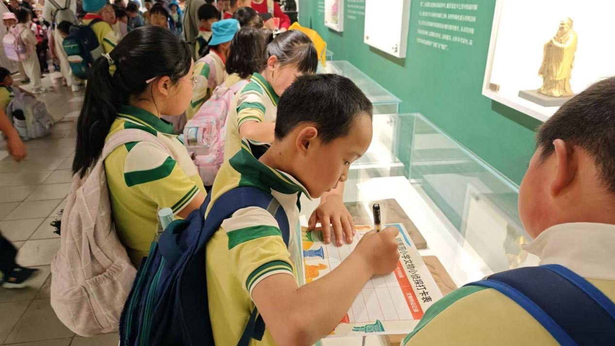 同学们化身小小文物侦探,手持《文物小侦探打卡表》,开启历史探索。大家近距离观赏气势恢宏的全铜金殿,细细寻找屋脊上的灵动神兽,认真品读殿内的铸字铭文,静静聆听吴三桂与金殿的传奇故事。在观赏七星宝剑、镔铁大刀、斑铜器物等珍贵文物时,孩子们亲手记录文物特点,完成打卡任务。此外,大家还跟着老师学习识别古建筑斗拱、门窗雕花,对比不同彩绘纹样,上了一堂生动鲜活的户外古建文化课。
