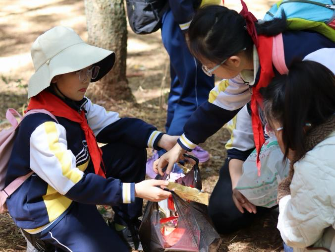在午餐时间,各年级同学们以班级为单位有序开展文明野餐。大家自觉铺好餐垫,分享自带美食,互帮互助,在欢声笑语中享受春日闲暇,并自觉践行“光盘行动”。