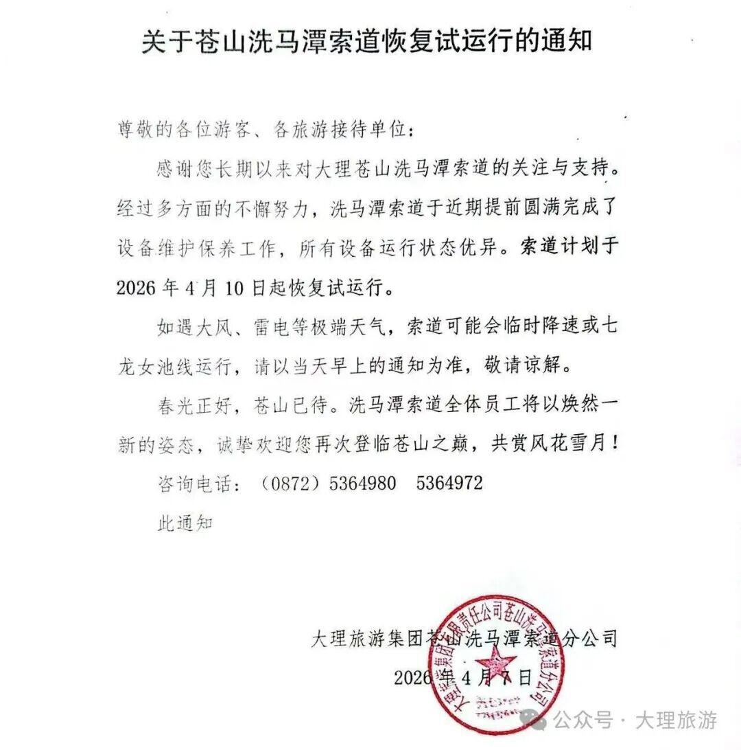 4月10日起,大理苍山洗马潭索道恢复试运行!