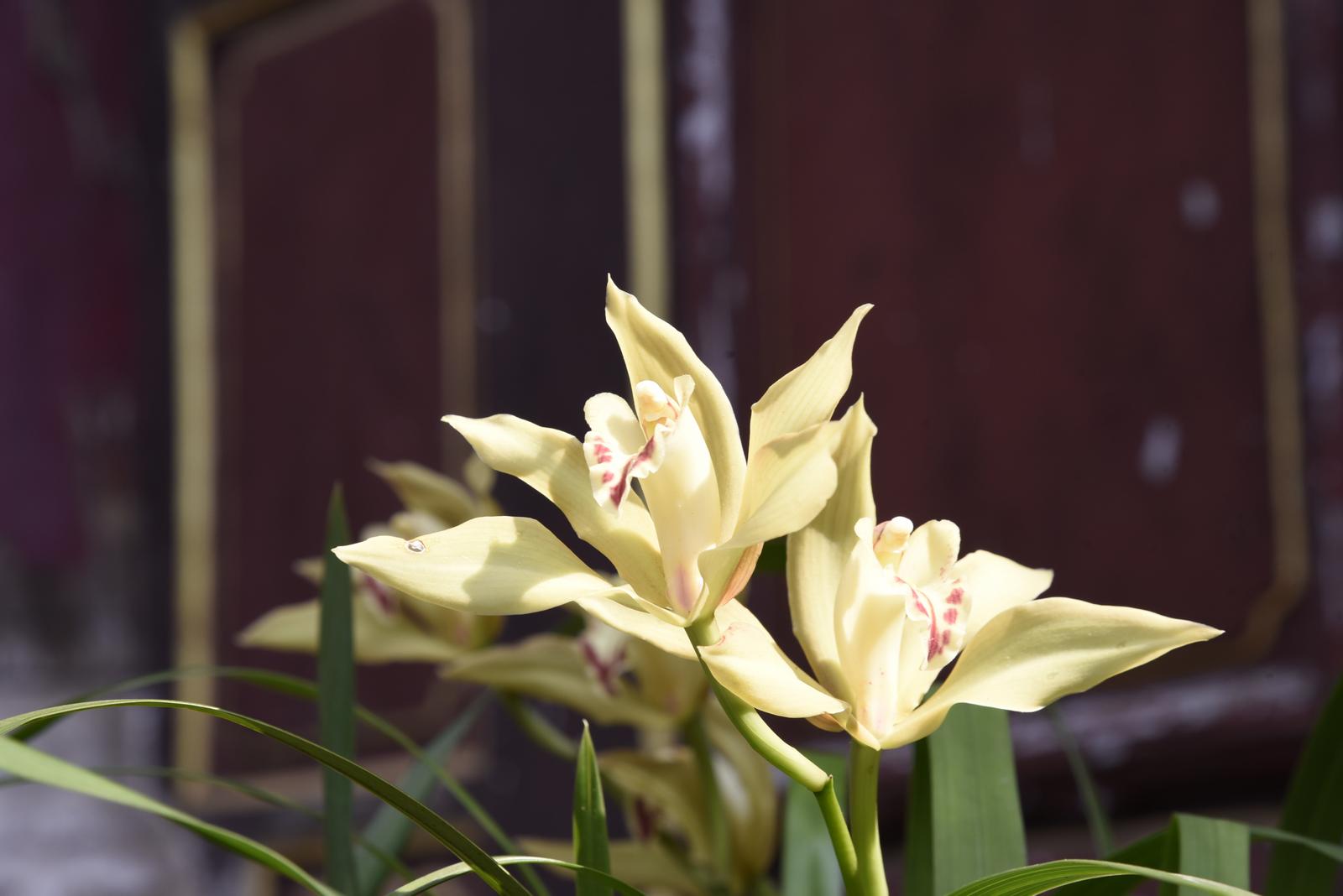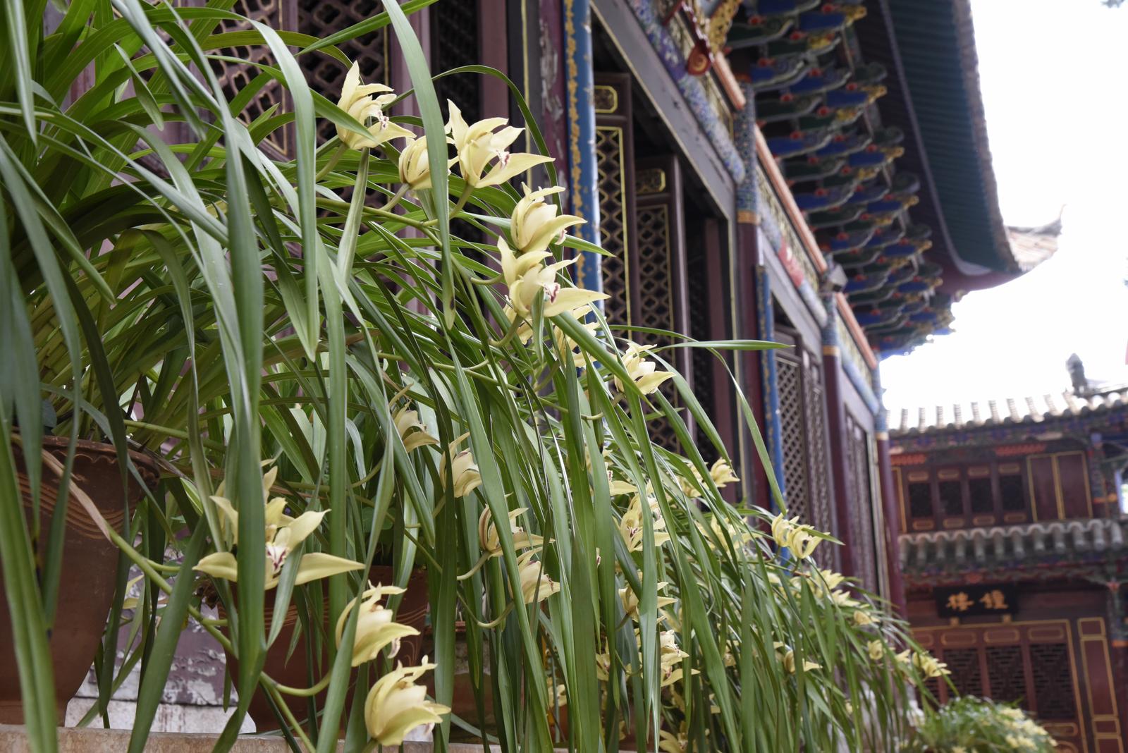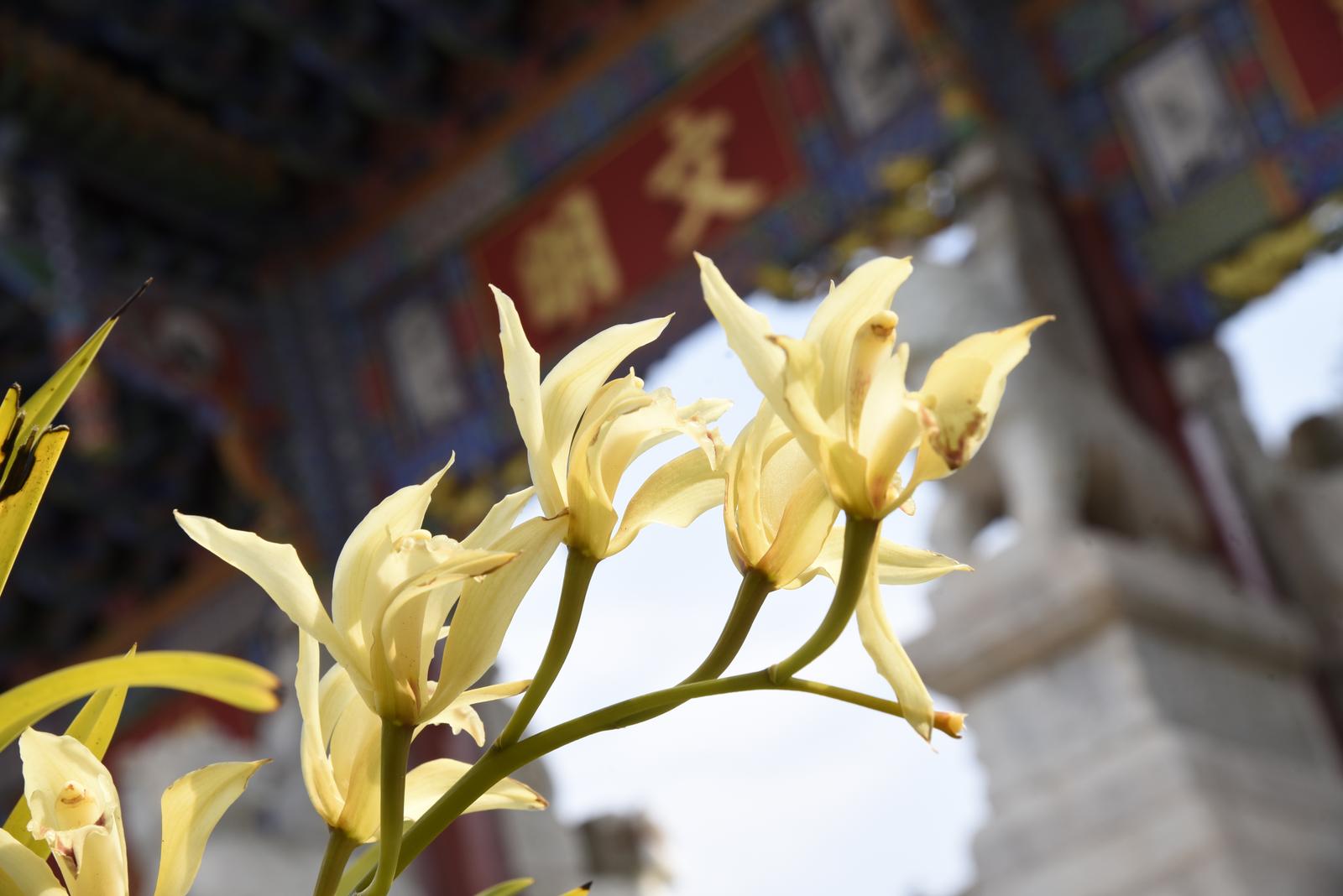 步入文庙,沿中轴线拾级而上,文明坊、大成殿等核心建筑及重要区域,虎头兰错落有致、蔚然成景。硕大的花朵舒展吐芳,黄绿花瓣间点缀着紫红斑纹,花姿雍容、幽香沁远,与庄重古朴的殿宇、精美的镂空彩绘、苍劲的古柏虬枝相融共生,勾勒出“古建藏幽芳 兰韵润儒风”的诗意画卷。
