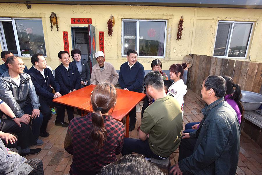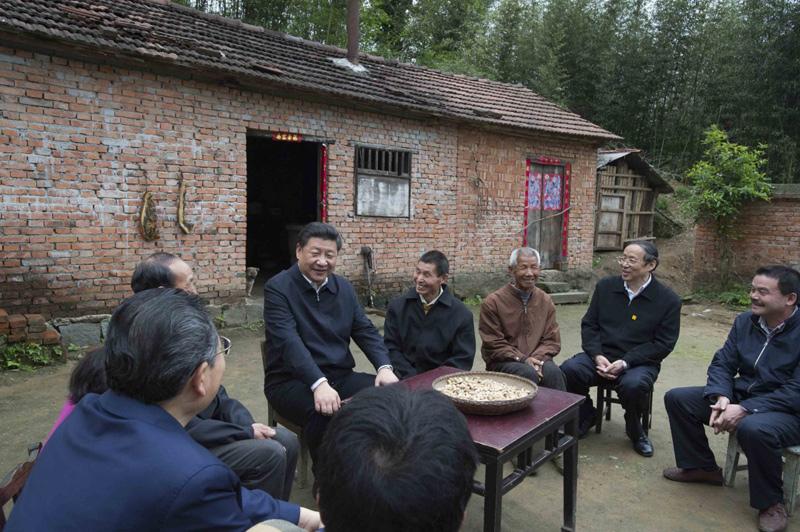 2016年4月24日下午,习近平在六安市金寨县花石乡大湾村向村民们了解脱贫工作情况。新华社记者 李学仁 摄