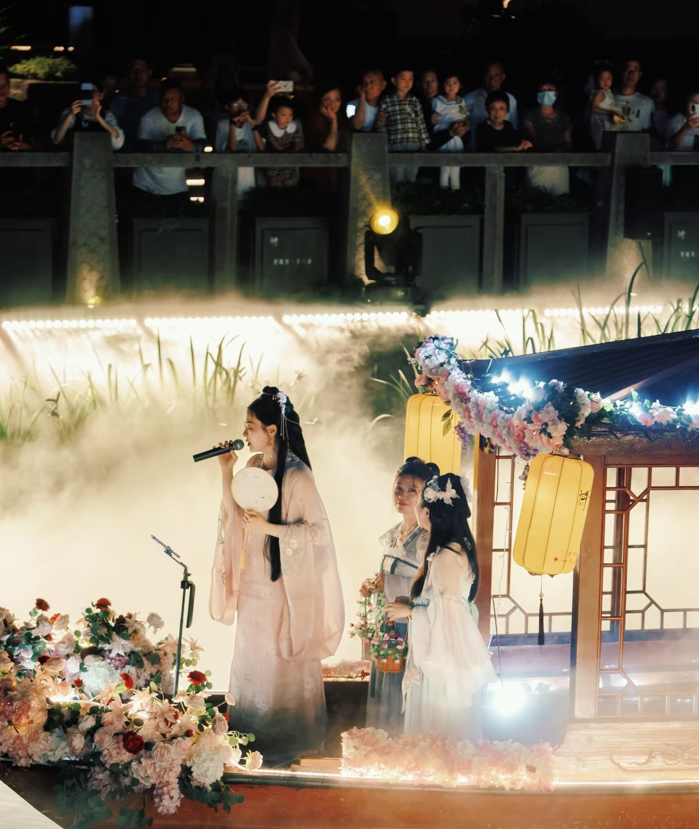 ·“古风歌曲演唱·声动湖山”传递深情韵味:身着古风服饰的歌手乘坐竹筏,演唱《兰亭序》《在水一方》《但愿人长久》等经典曲目,一旁的古筝演员现场伴奏,“水上演唱+传统乐器”的组合,让悠扬歌声与清澈湖景相互映衬,感染力十足。