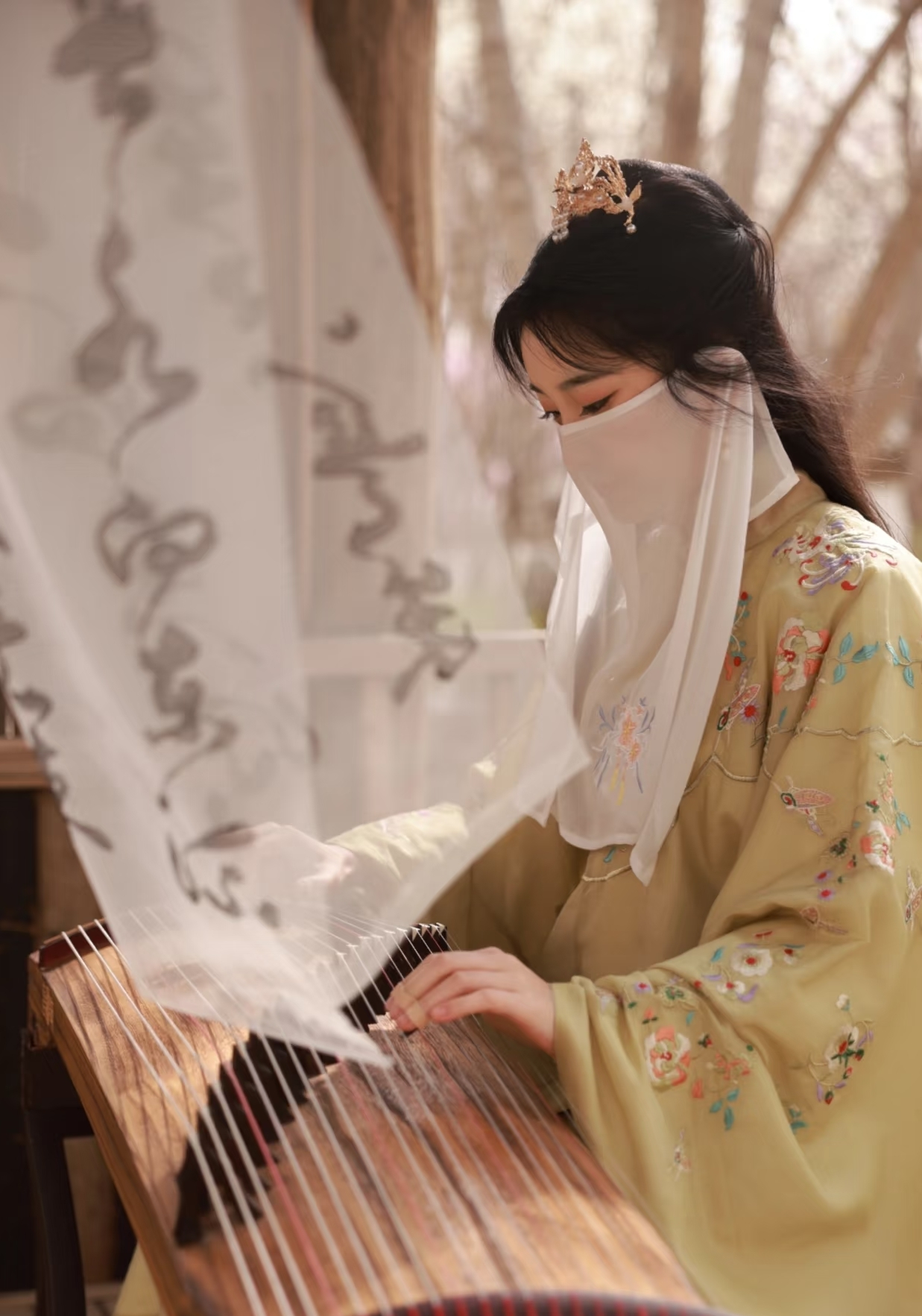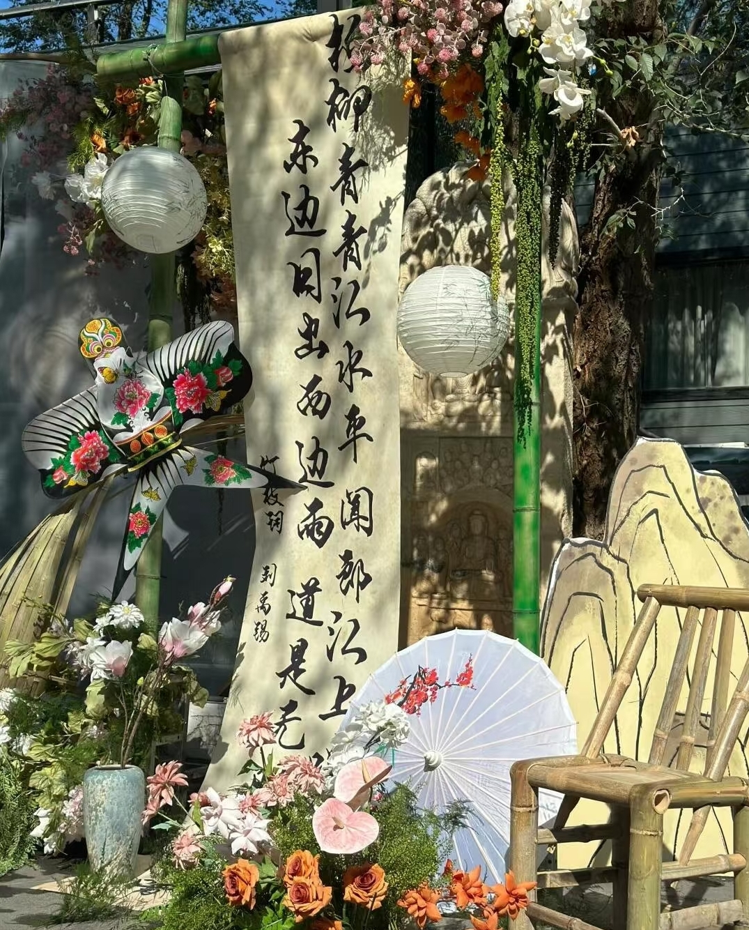 除了核心的水上演绎,野鸭湖还围绕“古风”主题打造全场景联动体验,让游客在欣赏湖光山色的同时,全方位感受双节氛围:在周边观赏区域,简约古风舞台上,古筝演奏者现场演绎《但愿人长久》《我和我的祖国》等曲目,悠扬琴音为双节增添温馨氛围;“森系古韵”打卡美陈融合自然与古风元素,满足不同年龄段游客的拍照需求;移动咖啡车与优化升级的围炉煮茶套餐(搭配中秋特色月饼),则为游客提供了在自然中休憩的惬意选择。