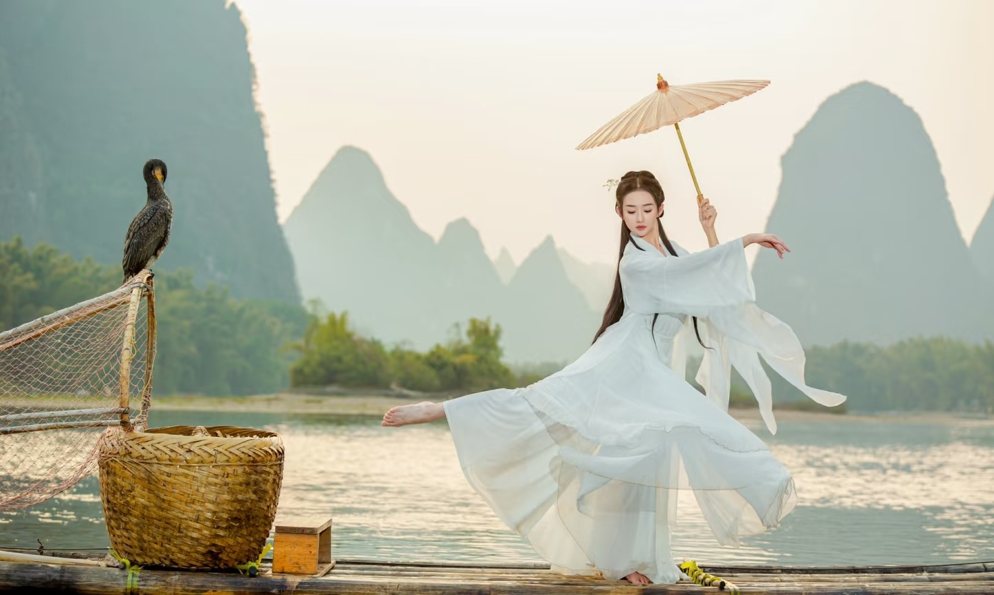 ·“古风舞蹈·水袖流光”尽显柔美典雅:3名身着精致古风服饰的舞者登上2艘相连竹筏,伴随《丽人行》《此生不换》等古典乐曲翩翩起舞,裙摆随动作在湖面波光中轻扬,水袖翻飞间,将传统舞蹈的韵味与湖水的灵动完美融合,宛如一幅流动的古风画卷。