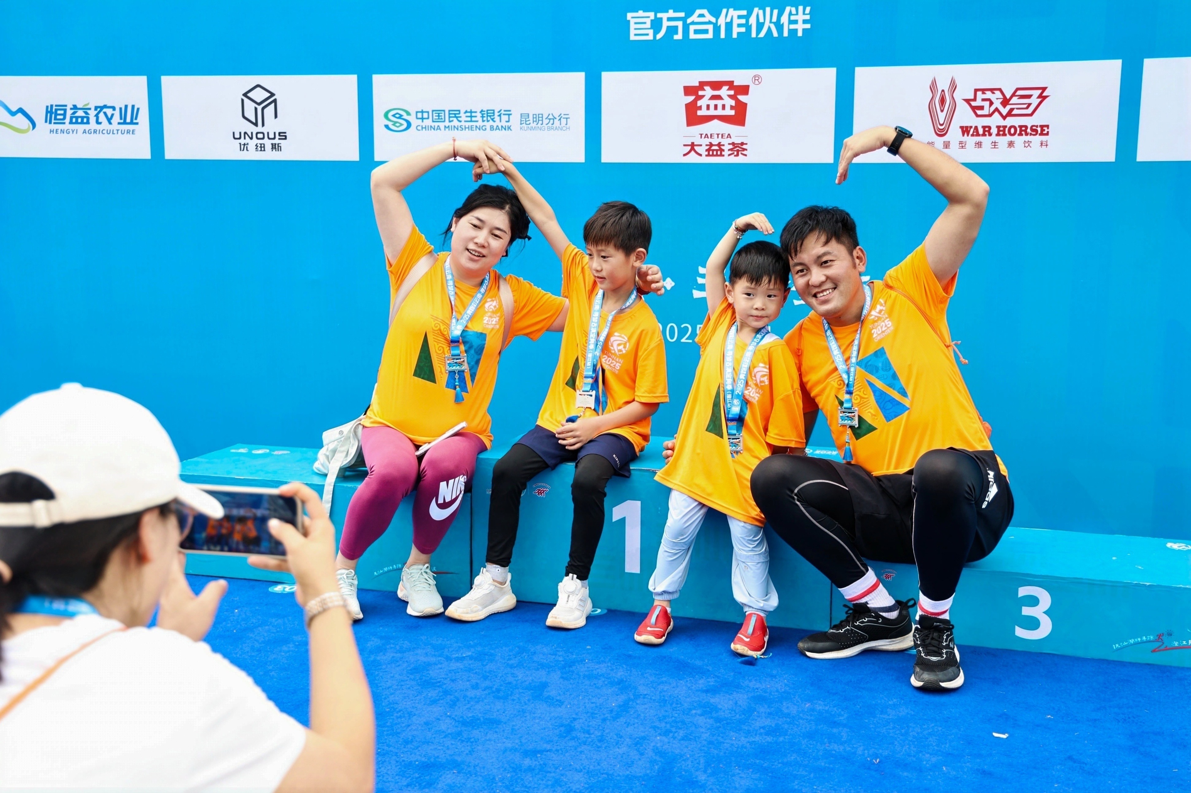赛事打破专业竞技与大众健身的壁垒,精英组聚焦专业竞速,公开组兼顾进阶体验,少年组侧重趣味成长,定向跑组为零基础爱好者敞开大门,亲子组则主打家庭互动,充分满足了不同年龄、不同水平人群的运动需求。其中,亲子组广受欢迎,共有555个家庭报名参赛。来自昆明的闻晓兰一家连续参加了五站赛事:“每站都有适合孩子的趣味环节,老大能独立跑少年组了,老二也正式参赛了,全家都在赛事里找到了乐趣。”孩子们不仅锻炼了身体,更学会了独立判断和团队协作,收获远超预期。