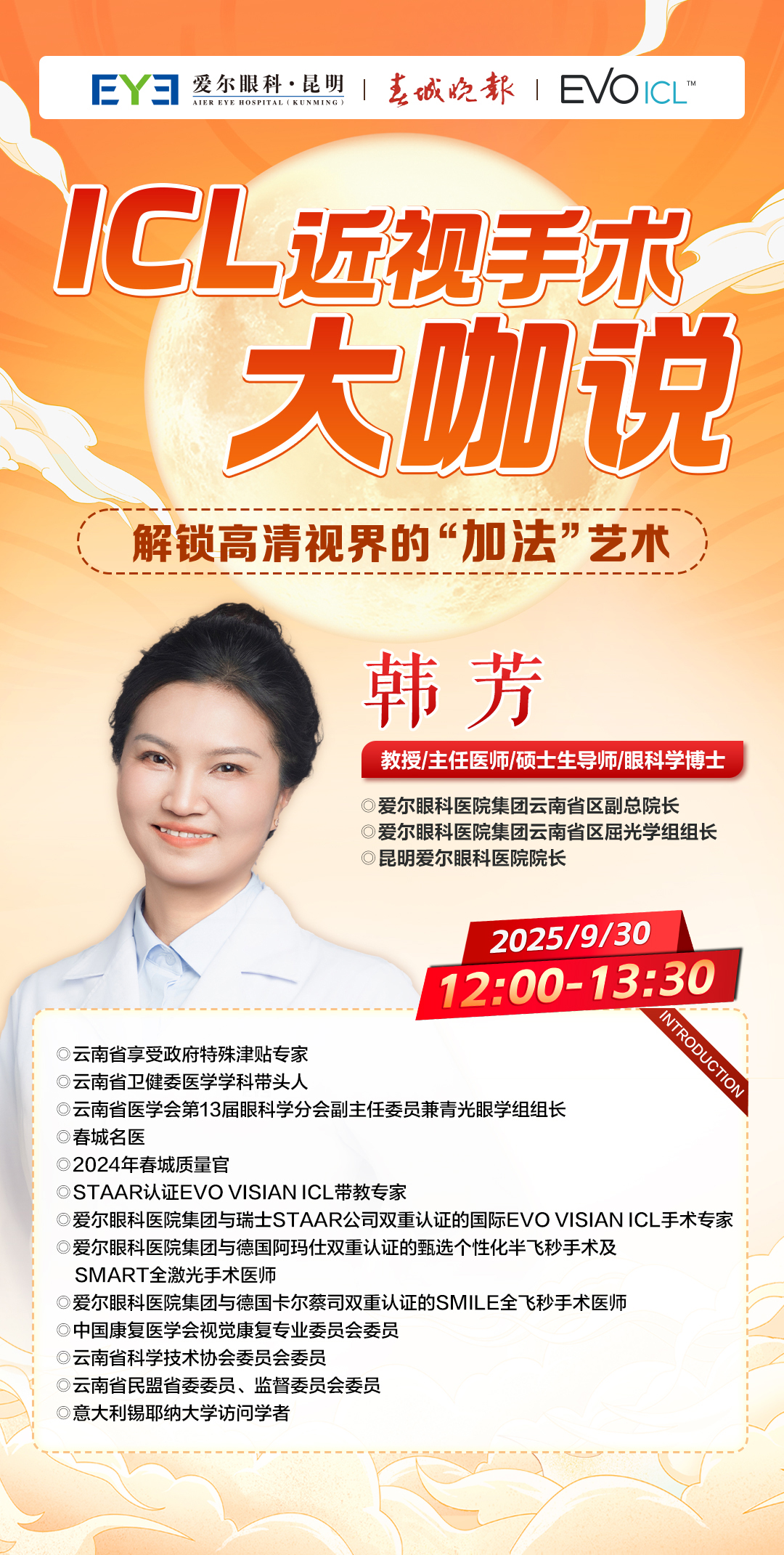9 月 30 日中午 12:00-13:30,春城晚报将联合昆明爱尔眼科医院推出主题为“国庆摘镜指南——近视手术的理性选择”的权威直播。本次直播我们邀请到一位真正“有料又敢说”的近视手术专家——昆明爱尔眼科医院韩芳院长,带来一场全程干货、零套路、纯科普的直播!
