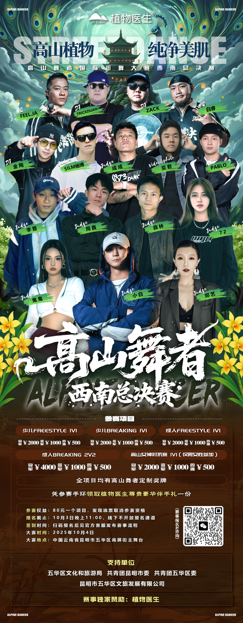 本次大赛由昆明市五华区文化和旅游局、共青团昆明市委、共青团五华区委及昆明市五华区文旅发展有限公司联合支持,并由植物医生独家赞助。赛事共设“少儿Breaking”“成人Breaking”“少儿Freestyle”“成人Freestyle”“高山女神对抗赛”五大竞技单元,覆盖全年龄段舞者,打造公平、专业又包容的街舞竞技舞台。其中“成人Breaking 2V2”冠军奖金更是高达4000元。