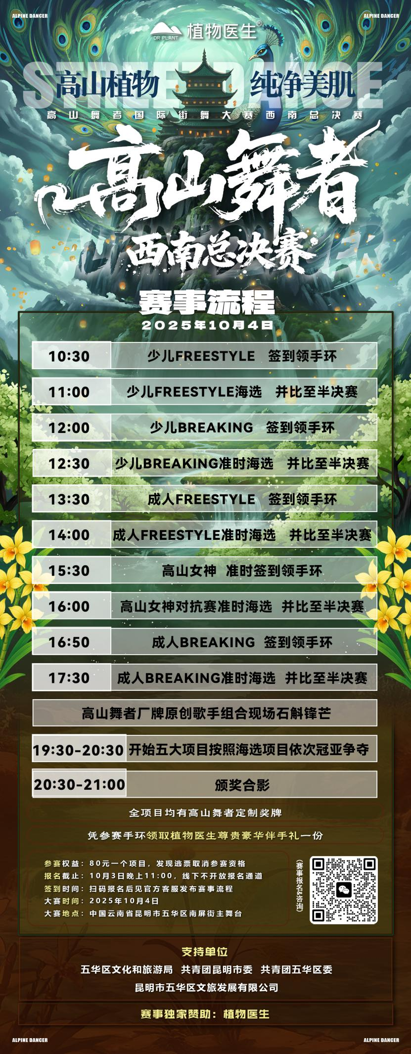 10月1日至4日,由植物医生主办的“高山舞者国际街舞大赛”西南总决赛,将在昆明市五华区南屏街火热开赛,赛事将汇聚数百位顶尖舞者同台竞技,巅峰对决蓄势待发。