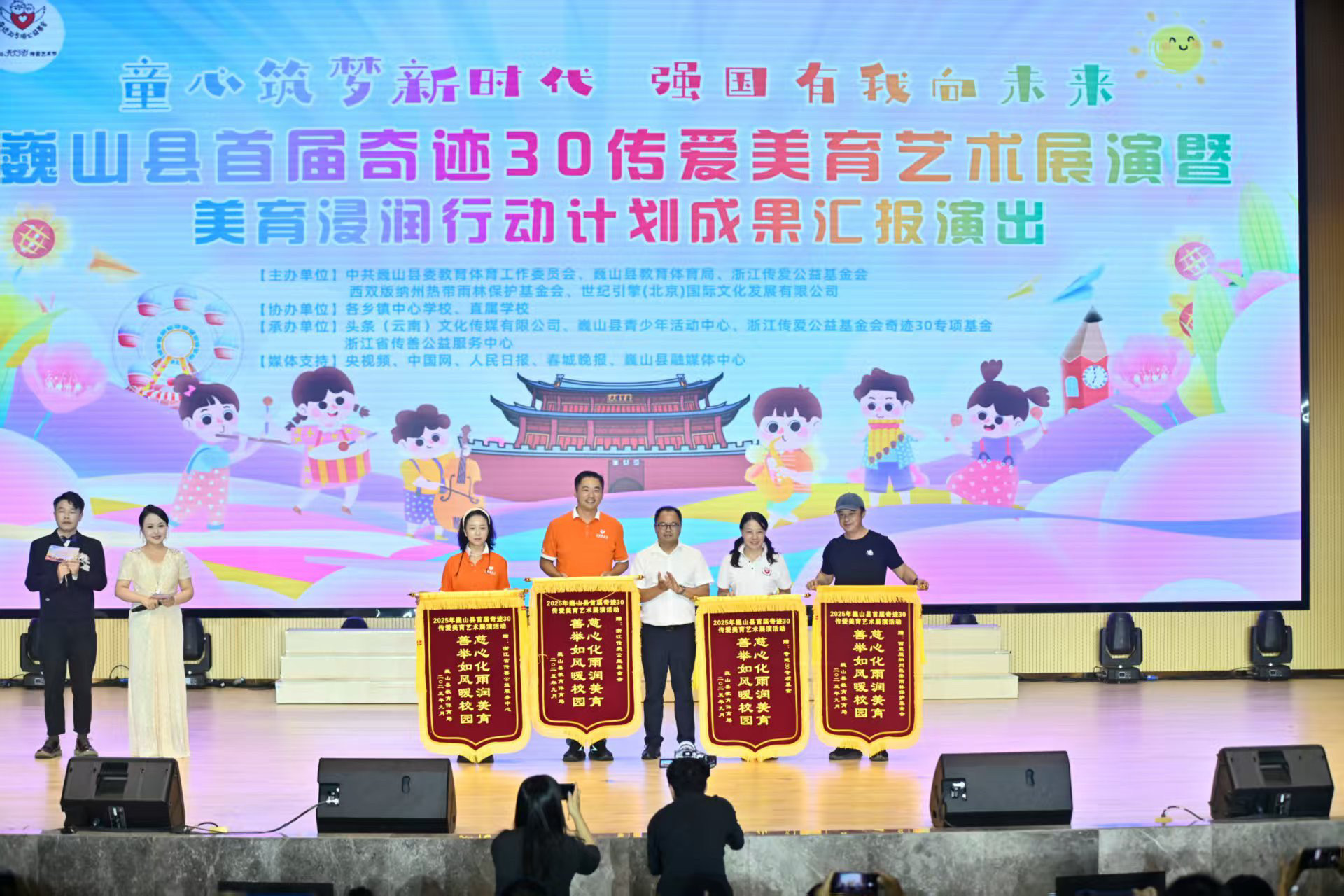 “序·山水清音”以清新灵动的节目拉开序幕;“韵·各族欢歌”节奏明快、色彩浓郁,集中呈现巍山的民族风情与非遗文化;“梦·筑梦华章”将活动氛围推向高潮,节目内容宏大,抒发了青少年对家乡的热爱与对未来的憧憬。活动中举行了捐赠授牌与优秀组织奖颁奖仪式。浙江传爱公益基金会、奇迹30专项基金等向巍山县教育体育局赠予了20万元捐赠牌,巍山县教育体育局回赠锦旗表达谢意。随后,活动对在组织工作中表现出色的六所学校授予“优秀组织奖”,以表彰其在美育实践中的卓越贡献。