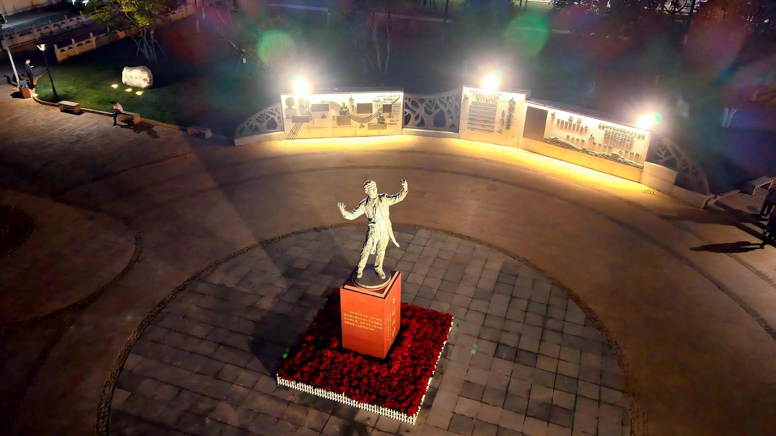 步入广场,中央矗立着由著名雕塑家袁熙坤老师倾情设计创作的聂耳雕像。作为从云南走向世界的艺术家,袁熙坤老师以对家乡的深厚情怀,将青春聂耳意气风发的神韵凝铸于青铜——左手握拳,右手挥拍,气势不凡,象征着当时全民族抵抗日本侵略者的怒吼:“起来不愿做奴隶的人们……”雕像基座则嵌有23菱转盒,象征聂耳23年短暂而辉煌的生命;底座镌刻《义勇军进行曲》手稿及“为国而歌”的题词,展现聂耳与国歌的历史联结。