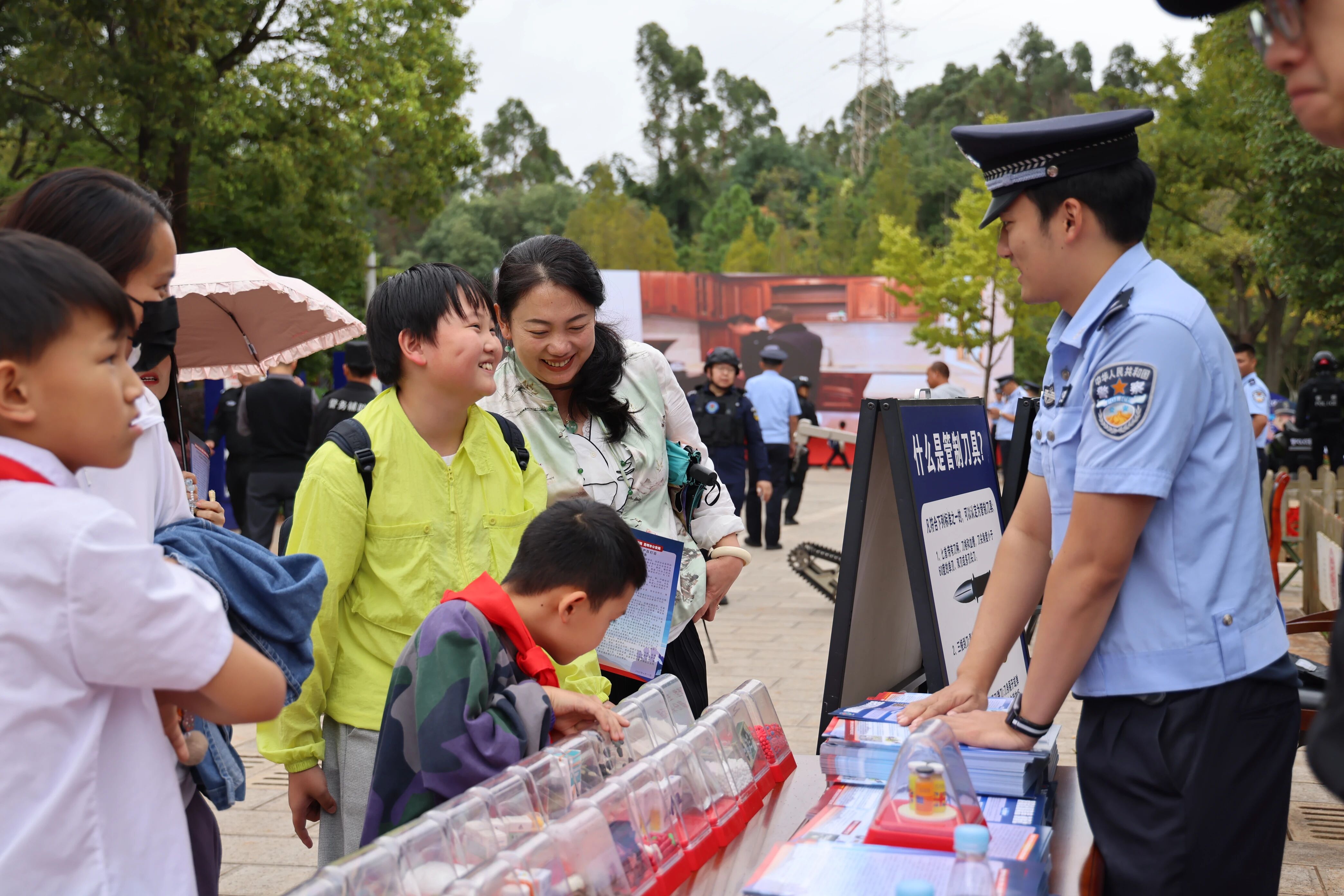 下午4点,昆明市公安局经开分局反诈宣传基地开班仪式在经开区观山公园举行,市民纷纷驻足观看并参与活动。活动现场,家长带着孩子辨认毒品模型,小朋友围在警用装备前好奇提问,灵巧的警用机器狗展示引来阵阵惊叹,有奖问答区排起长队,“陌生链接不能点”等抢答声此起彼伏。