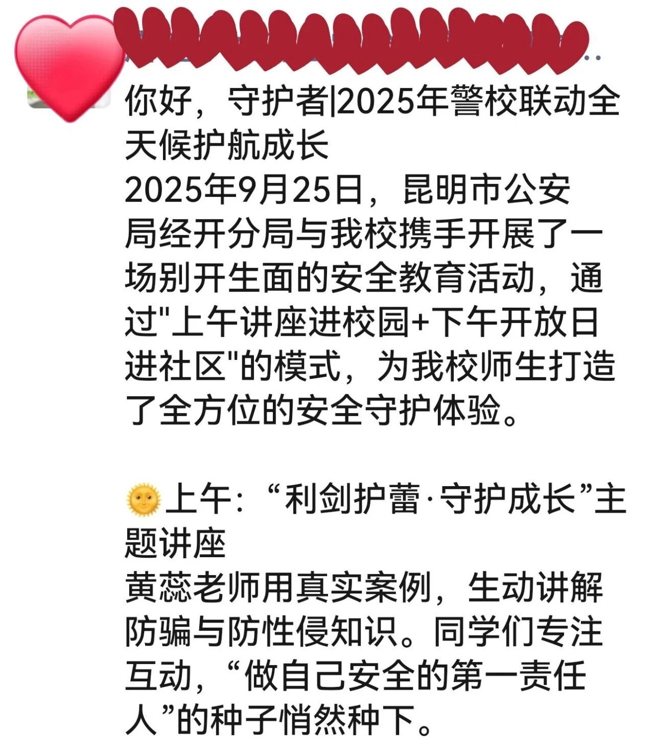 副校长的朋友圈最后写道:“当校园安全教育与社区安全体验无缝衔接,当藏蓝守护与学子日常紧密相连,这一天我们深刻体会到,所谓的岁月静好,正是这一抹守护色用忠诚与智慧在校园内外为我们撑起的一片晴空。”