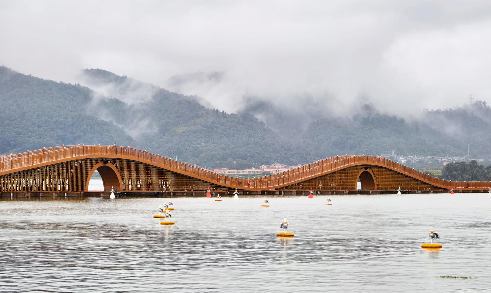 滇池草海开合浮桥于9月30日试通行,现场使用无人机“花路开桥”,从空中撒下鲜花花瓣。别具一格的开桥仪式,引来市民欢呼。