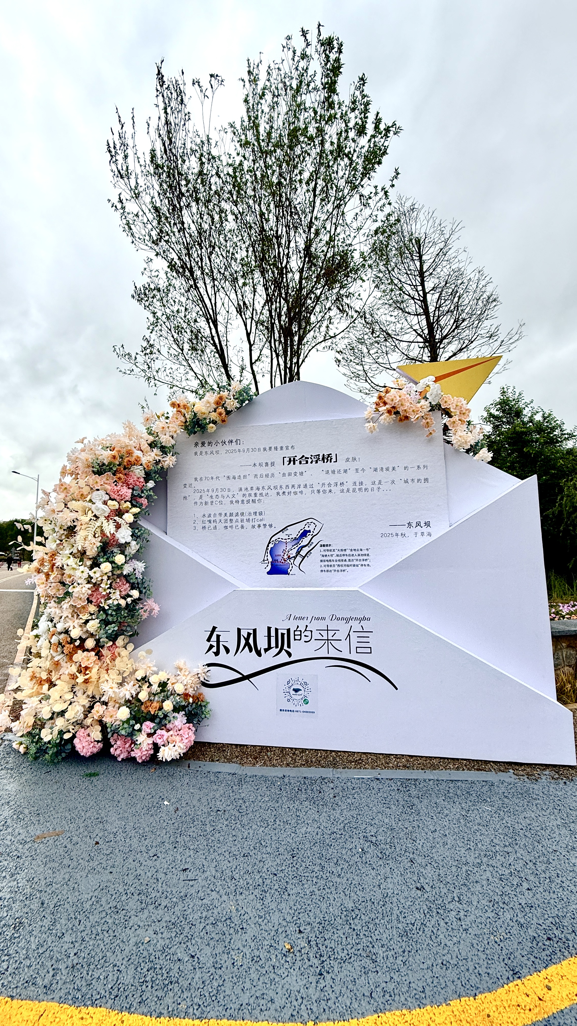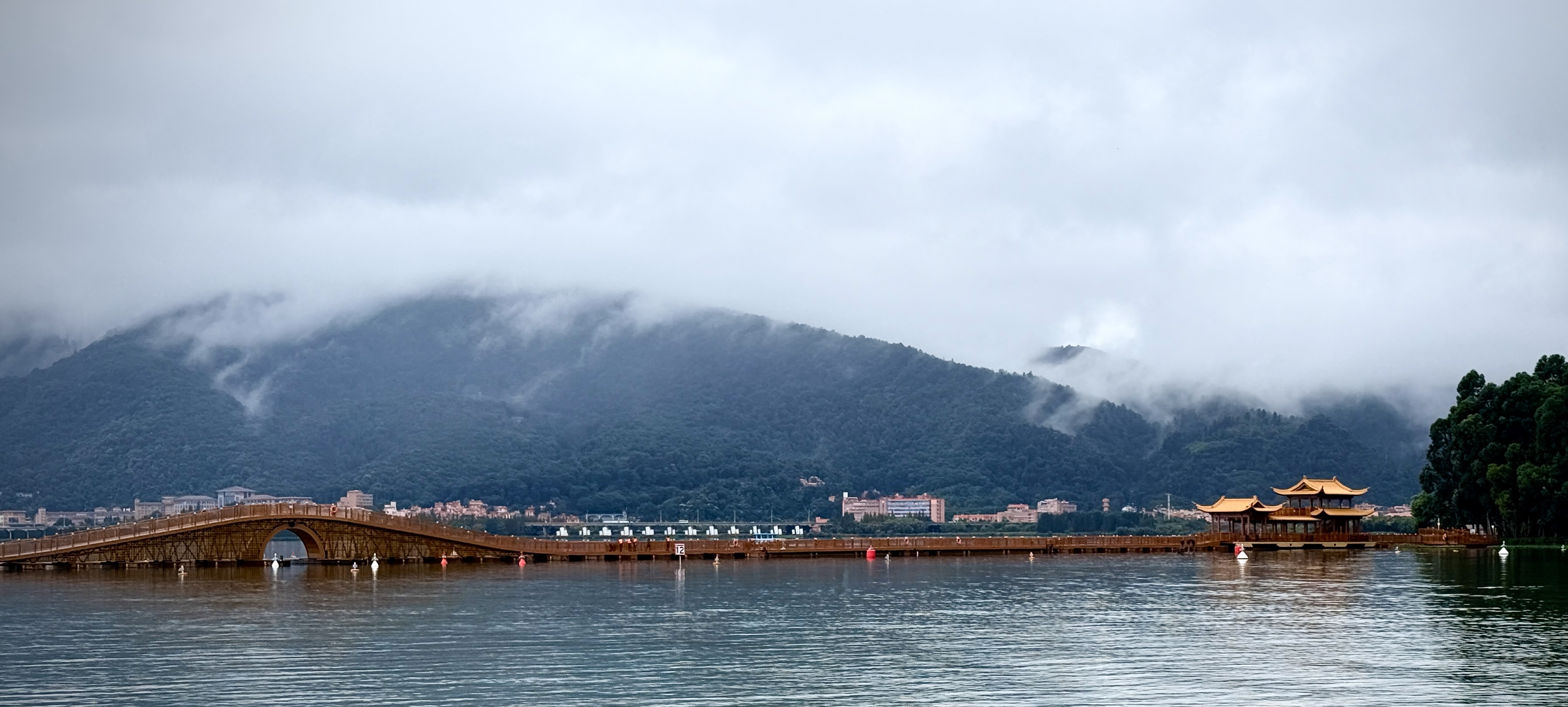 当天上午,淫雨霏霏中,不少市民满怀期待冒雨而来,只为抢先感受开合浮桥带来的全新体验。烟雨中,这座以画舫为灵感设计的七孔浮桥串联起碧波万顷,与大观公园中的大观楼、石画舫遥相呼应,成为草海上的新景观。10时,无人机撒下玫瑰花雨,浮桥正式开放。