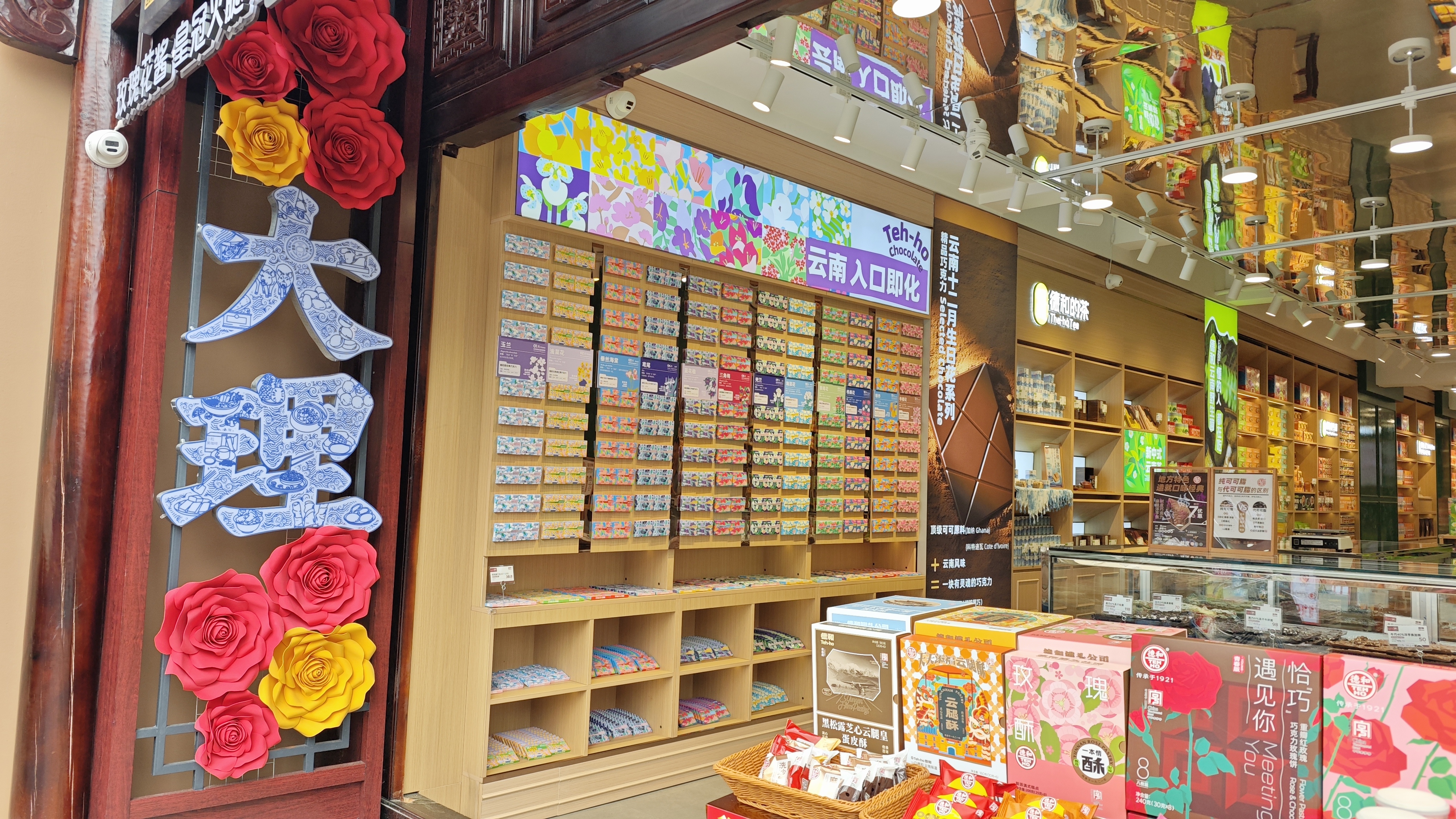 这种创新不止于咖啡。店内同步推出的“花语盲盒巧克力”,将云南四季花开的美好寓意装入其中;瓦猫造型的巧克力点缀在咖啡杯沿,既好看又好拍;野生菌系列产品、非遗甲马元素的松茸饼干、扎染包裹的七子茶饼等,都在用新潮方式讲述云南故事。