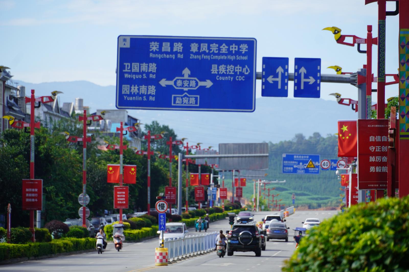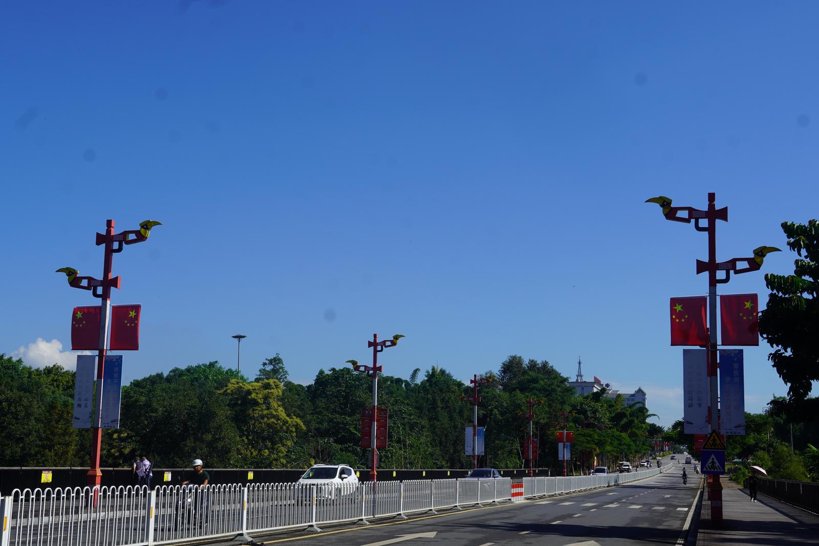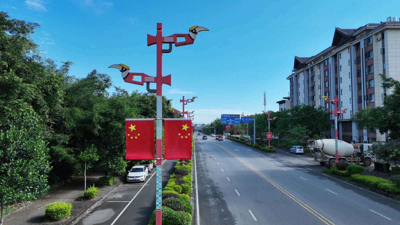 金秋时节,微风吹拂。为庆祝中华人民共和国成立76周年,德宏陇川的限定“中国红”已上线!各主干道国旗招展,绿意盎然,每一处景致都在共庆祖国76周年华诞。