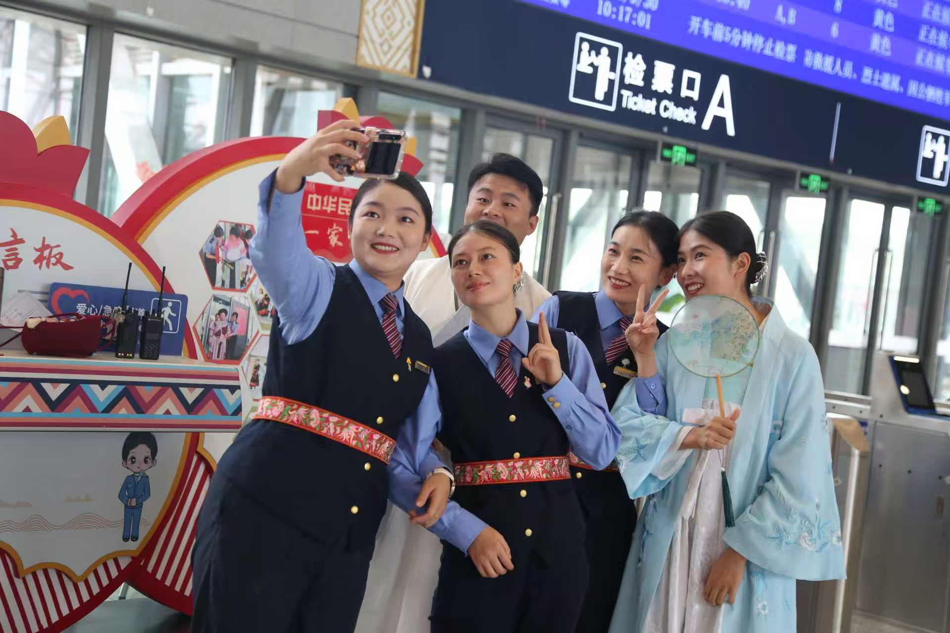 10月1日,国铁昆明局红河高铁站内,人山人海、气氛热烈,一场以“高铁连山海 家国共团圆”为主题的营销活动正在火热展开。车站工作人员和当地文旅部门志愿者“路地联动”,为旅客带来了一场极富民族风情和家国情怀的视听盛宴。