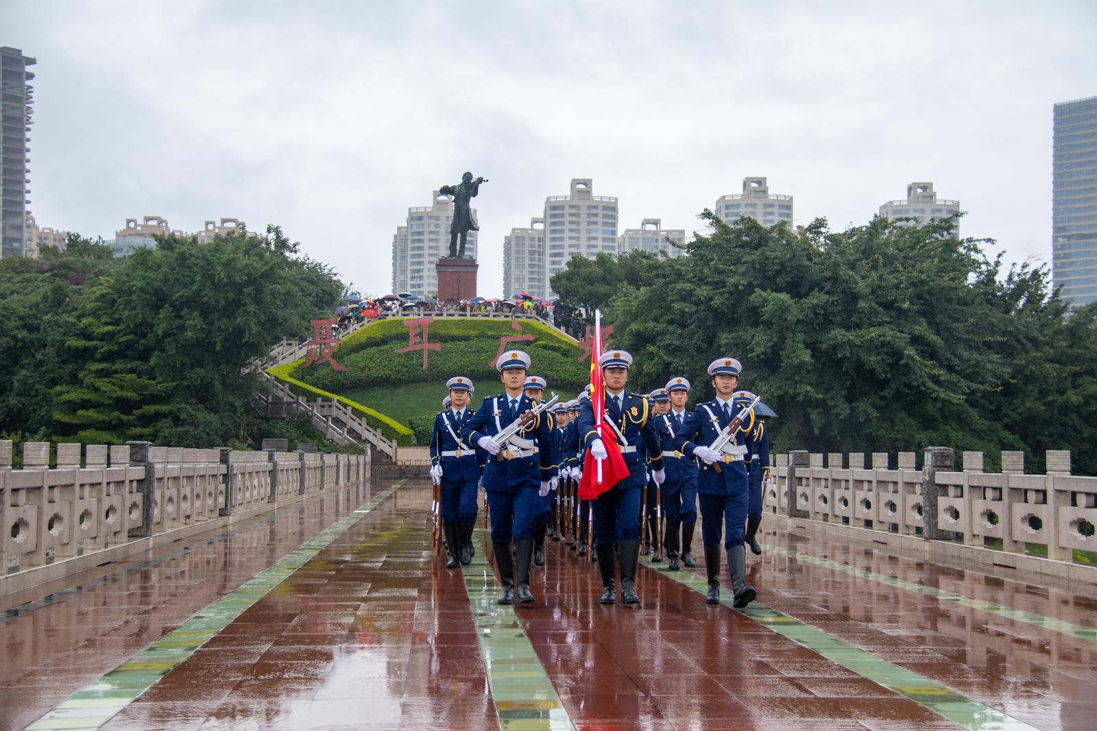 上午9时,雨幕之中,玉溪消防聂耳广场国旗护卫队肩负着光荣的使命,他们护卫着五星红旗,迈着铿锵有力的正步庄严入场。雨水打湿了队员笔挺的礼宾服,帽檐上挂满了晶莹的水珠,但他们的步伐依旧整齐划一,眼神坚毅如炬,彰显着国旗卫士的忠诚与担当。