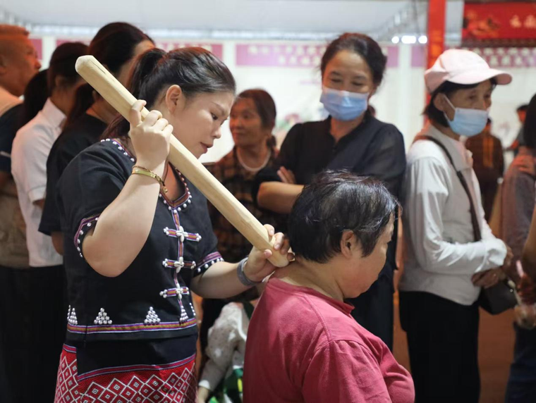 在随后几天的“非遗展示”“大健康产品推介”等主题日中,民族医药适宜技术展示成为最大亮点。拉祜族松明疗法、佤族药滚疗法、佤医花椒针疗法、棒杵疗法、小儿吸痧走罐等一批富有民族特色的疗法登台演示,吸引众多群众驻足。在中医适宜技术体验区,人们争相体验中药足浴、针灸、艾灸等技术;蒙医、傣医、佤医技术体验摊位前,围起了厚厚的人墙,大家纷纷排队体验蒙医熏鼻疗法、傣医拖擦疗法、佤医药滚疗法。而在义诊区,来自省内各中医院的70余名专家轮流出诊,为群众健康把脉问诊。