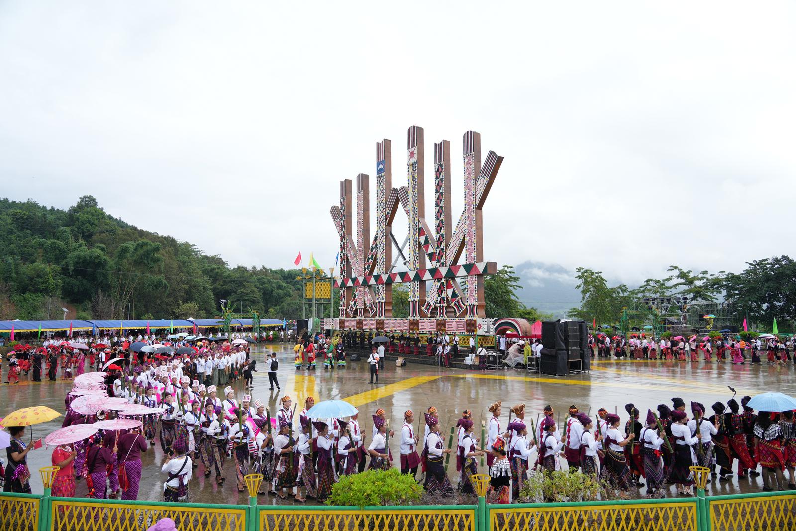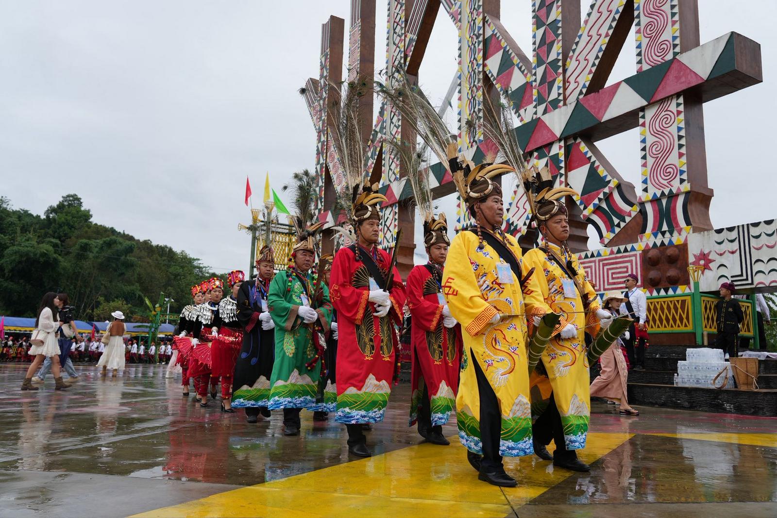 各族群众组成的“长龙”,在“瑙双”和“瑙巴”的引领下,踏着激昂的鼓点,在象征景颇族祖先迁徙路线的“目瑙示栋”下纵情起舞,欢庆中华人民共和国成立76周年。