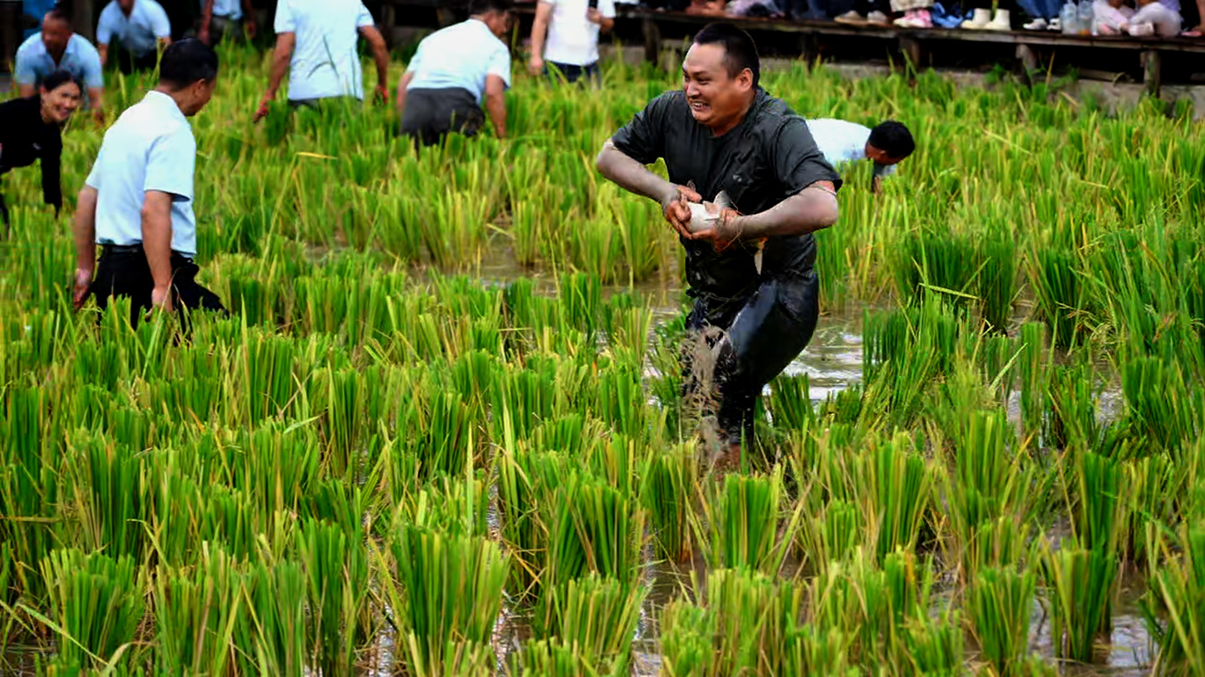 午后的稻田公园,雨水丝毫没浇灭热闹劲儿。捉鱼比赛在稻田间火热开场,参赛者挽着裤腿踩进田里,雨水混着泥水溅满衣裤,却挡不住追逐稻花鱼的欢腾——有人俯身追鱼,有人伸手合围,笑声、欢呼声裹着雨丝荡漾在绿水青山间。