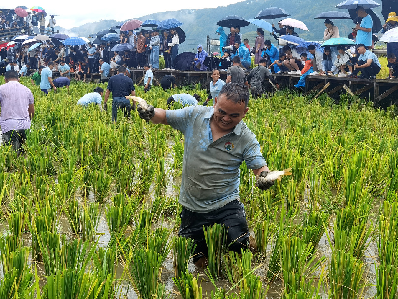 “今天抓了10多条,过瘾!”弄玲村代表队选手王开祖举着蹦跳的鱼,脸上满是雨水和笑意。一旁的游客岳子豪、呼子彦挤在围观人群中,满是心动:“雨里看他们捉鱼很有意思,我们也想试试!早上吃的稻花鱼,鲜得能尝出稻田的香味。”