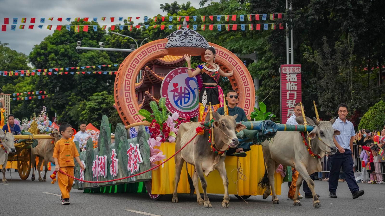 本次民族风情巡游狂欢分“五彩纷呈庆胞波”“边陲流淌民族风”“瑞丽跨进新时代”3个篇章。其中2辆主题彩车以“中缅建交 75 周年”“一带一路合作共赢”为主题,通过立体造型、灯光特效和动态展示中缅多元民族文化,呈现中缅交往的历史脉络与新时代合作成果;20辆牛车通过融入中缅传统纹饰、非遗、现代科技等元素,既是边地农耕文化的体现,也是中缅民间工艺的集中展示;13支巡游方队涵盖中缅民间表演团队、德宏各民族服饰展演队、非遗代表性传承人队伍等。