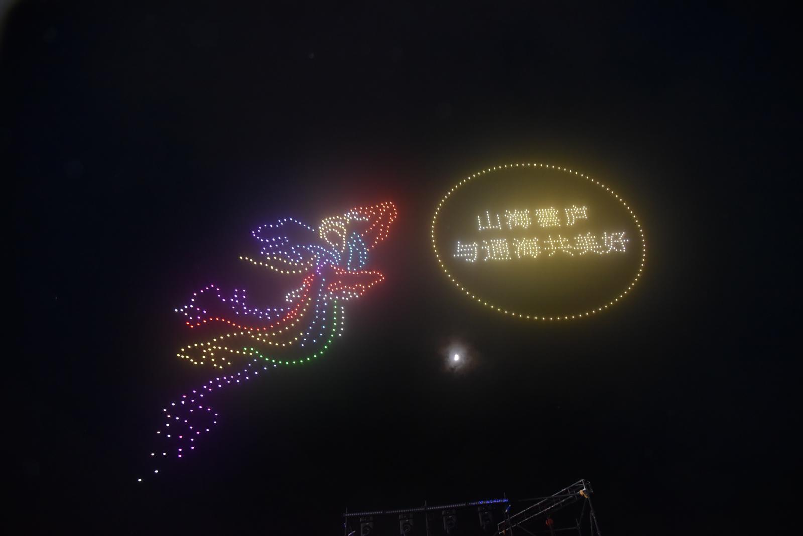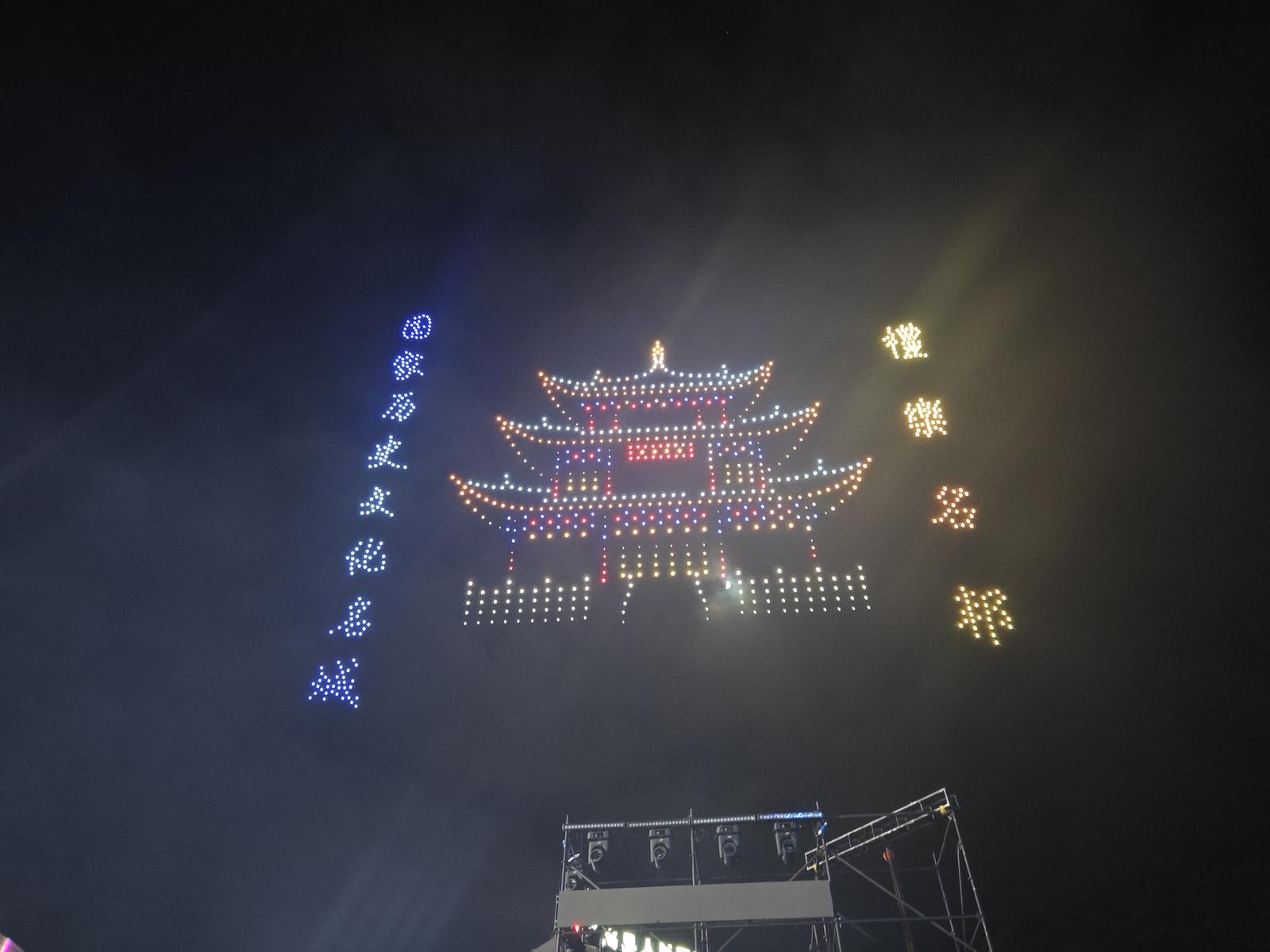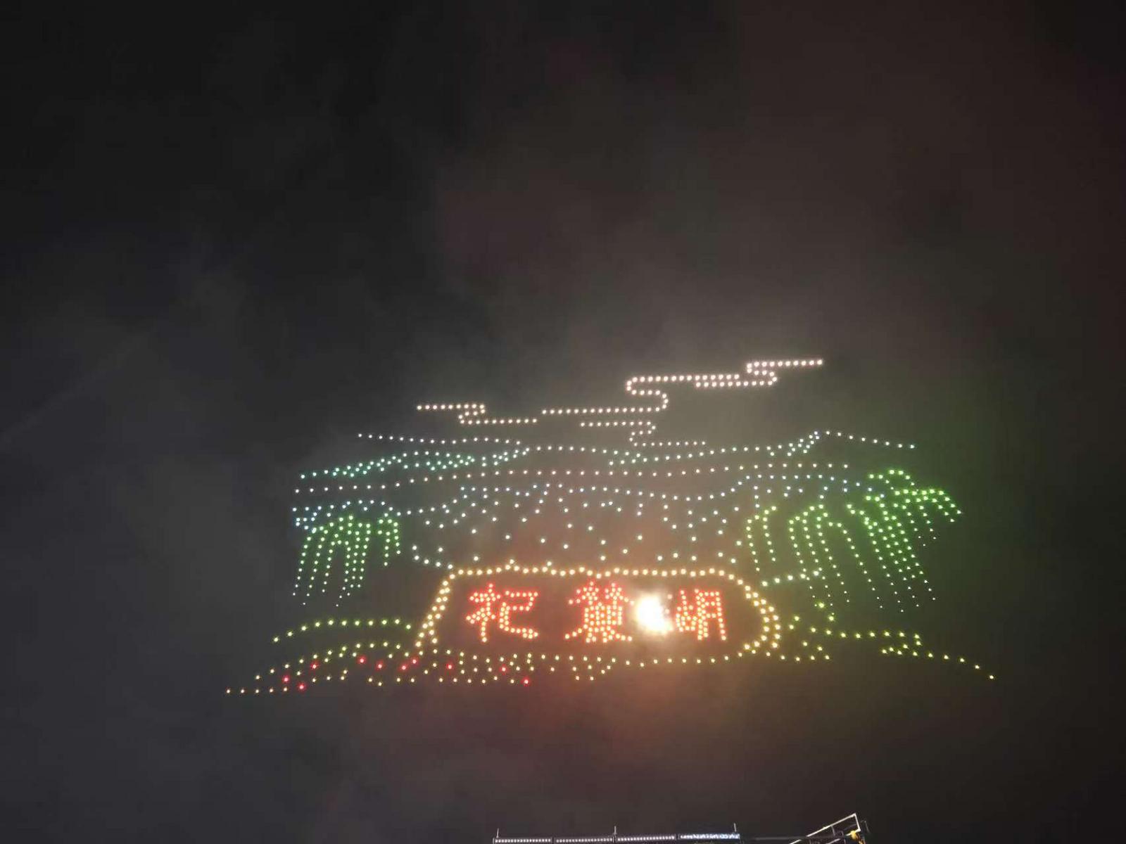 20时30分,晚会迎来最令人期待的环节——千架无人机表演。随着音乐渐起,千架无人机从体育场一侧腾空而起,以深邃夜空为幕布,以璀璨灯光为画笔,开始了一场震撼人心的“空中作画”。短短几分钟内,五星红旗、腾飞巨龙、通海标志性建筑聚奎阁等12幅精心设计的动态画面依次呈现,通海悠悠文化、中秋团圆意蕴与国庆喜庆氛围实现完美交融。震撼的画面,让现场观众不约而同起身欢呼,手机闪光灯与无人机灯光交相辉映,形成一片光影海洋,将晚会气氛推向高潮。