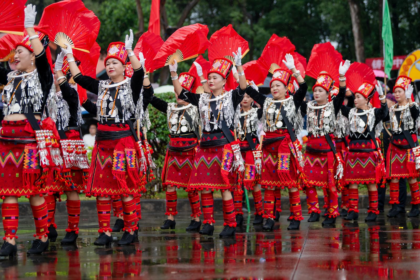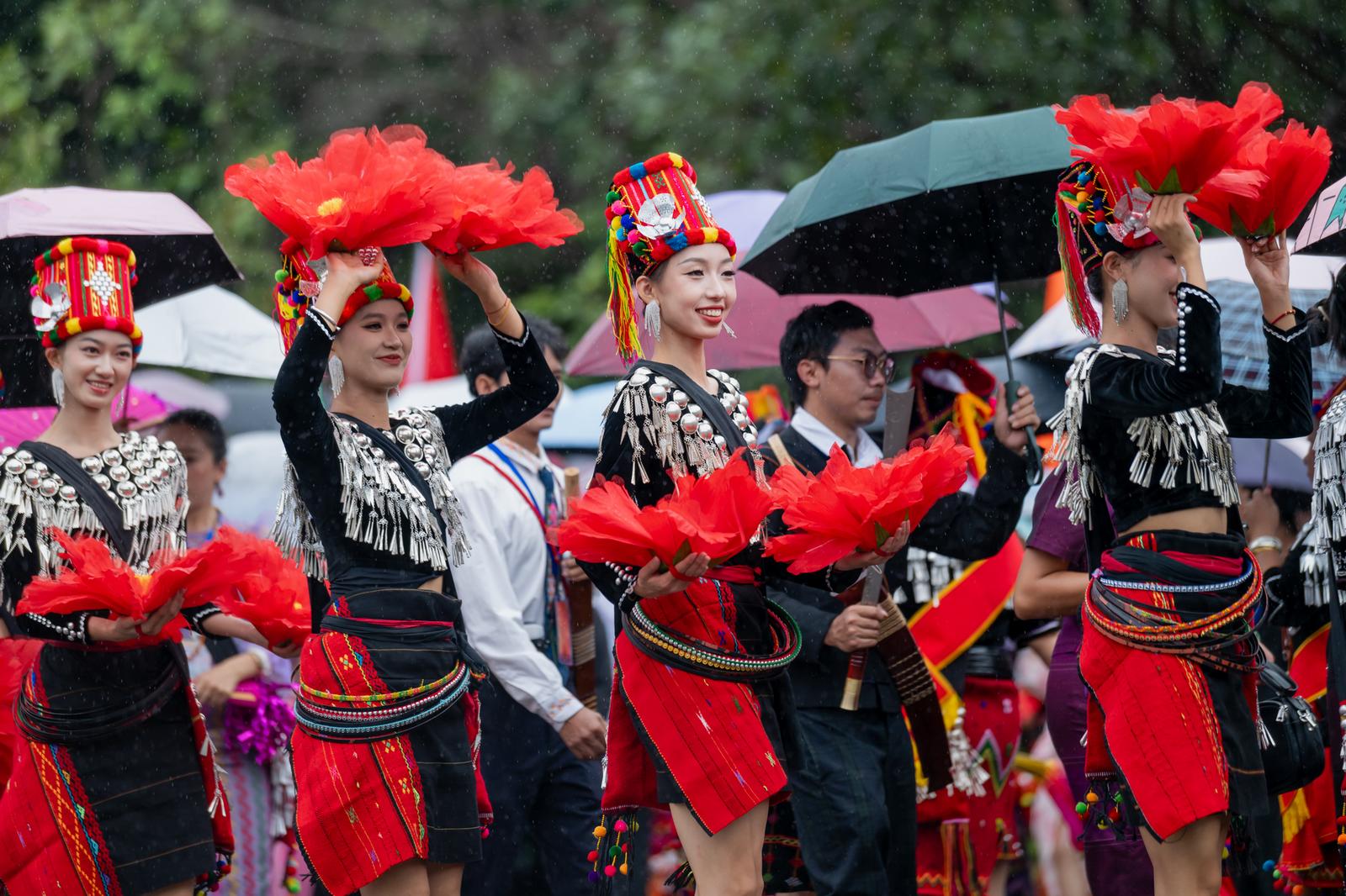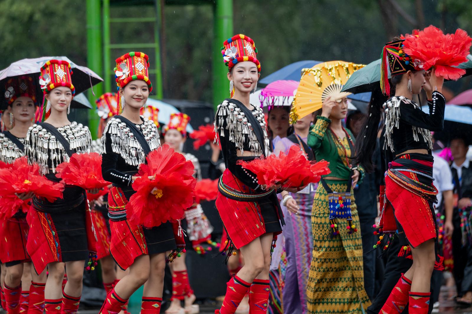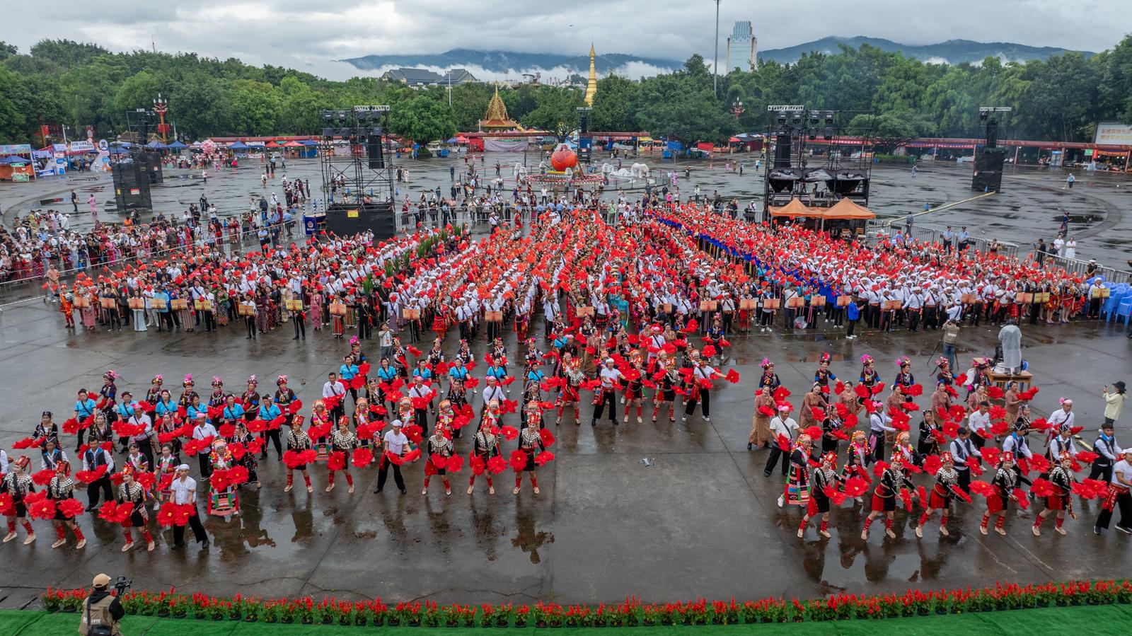 当天,虽然陇川的天空下着小雨,但是仍挡不住大家的热情。目瑙纵歌场上,在瑙双、瑙巴的引领下,身着节日盛装的陇川各族儿女与四方宾朋,踩着同一节拍,以螺旋形的队伍缓缓进入目瑙纵歌场。顷刻间,铿锵的鼓点、浑厚的铓锣声与激昂的乐声交织,瞬间点燃了现场的激情。