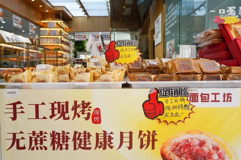 作为中秋节当之无愧的“主角”,各式各样的月饼礼盒和散装月饼占据了市场的“C位”。除了经典的云腿、蛋黄莲蓉、水果等口味外,不少店铺还推出了各种新口味月饼,以满足消费者多样化的需求。BEETEAM面包工坊的老板说:“临近中秋,月饼的销量很好。店里上新了各种口味的月饼,还有无蔗糖的、低糖的月饼,满足顾客不同的需求。”