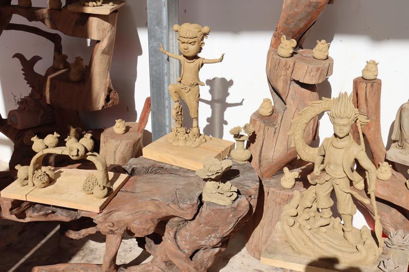 泥塑与木雕展区散发着浓郁的乡土气息与艺术韵味。泥塑作品题材丰富,既有葡萄、石榴等宾川特色水果,也有孩子们喜爱的哪吒、十二生肖等“国潮”动漫形象,游客带着孩子亲手触摸湿润的陶泥,体验泥塑的乐趣。