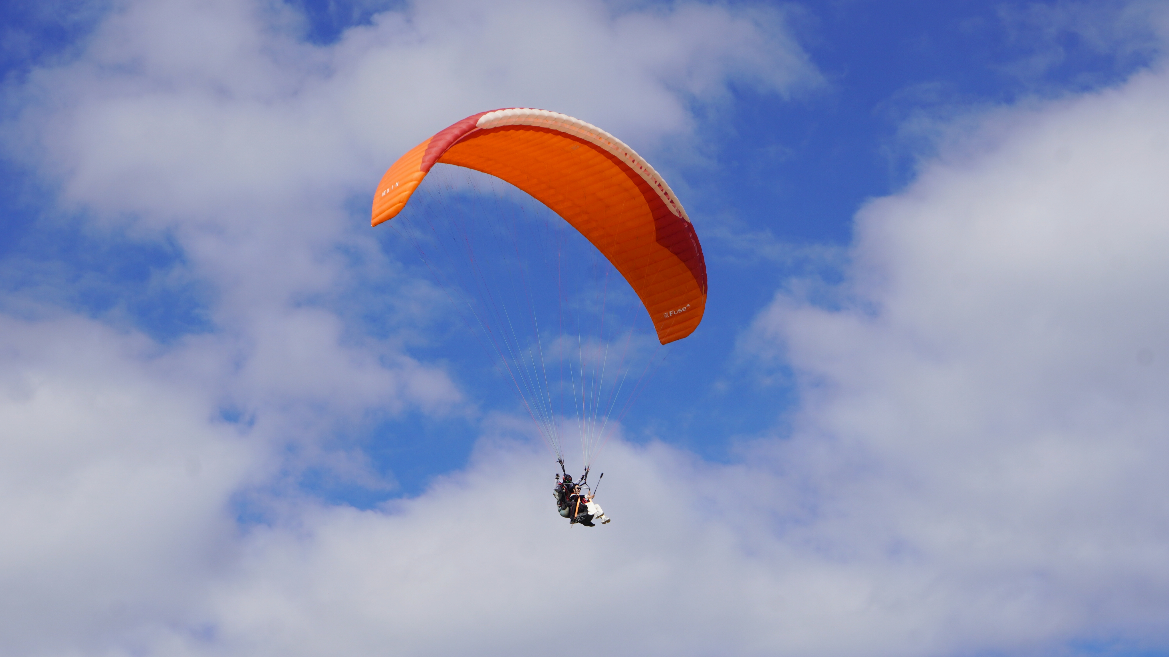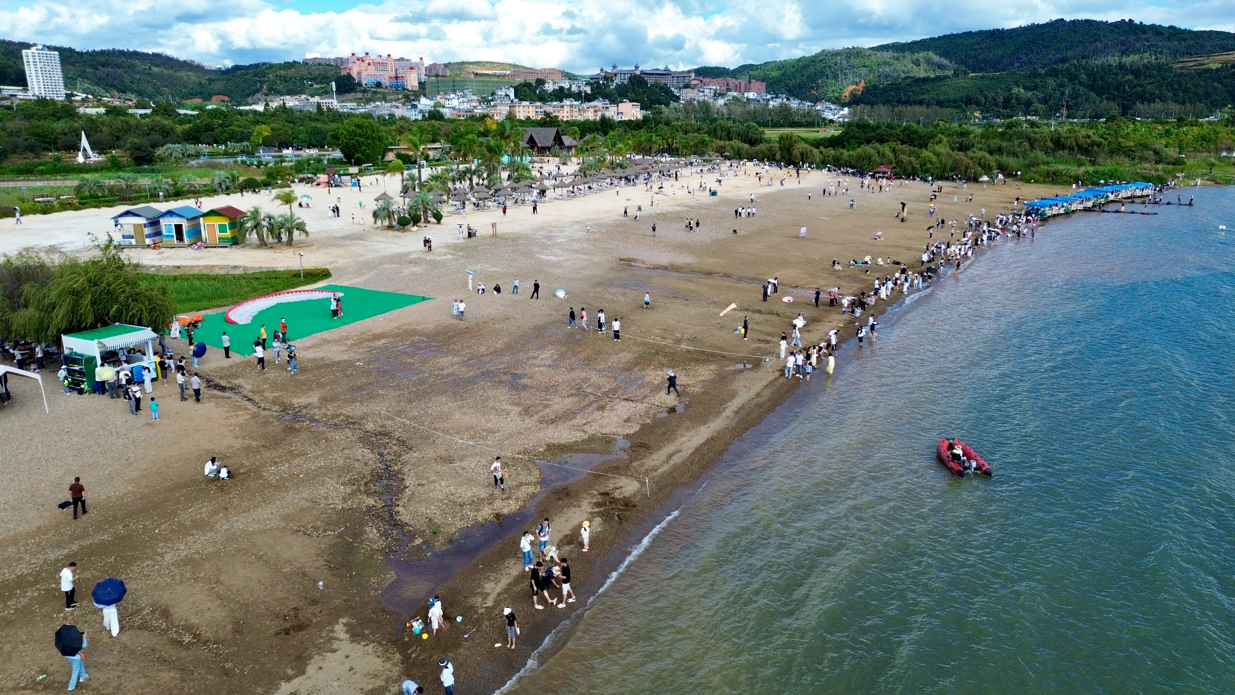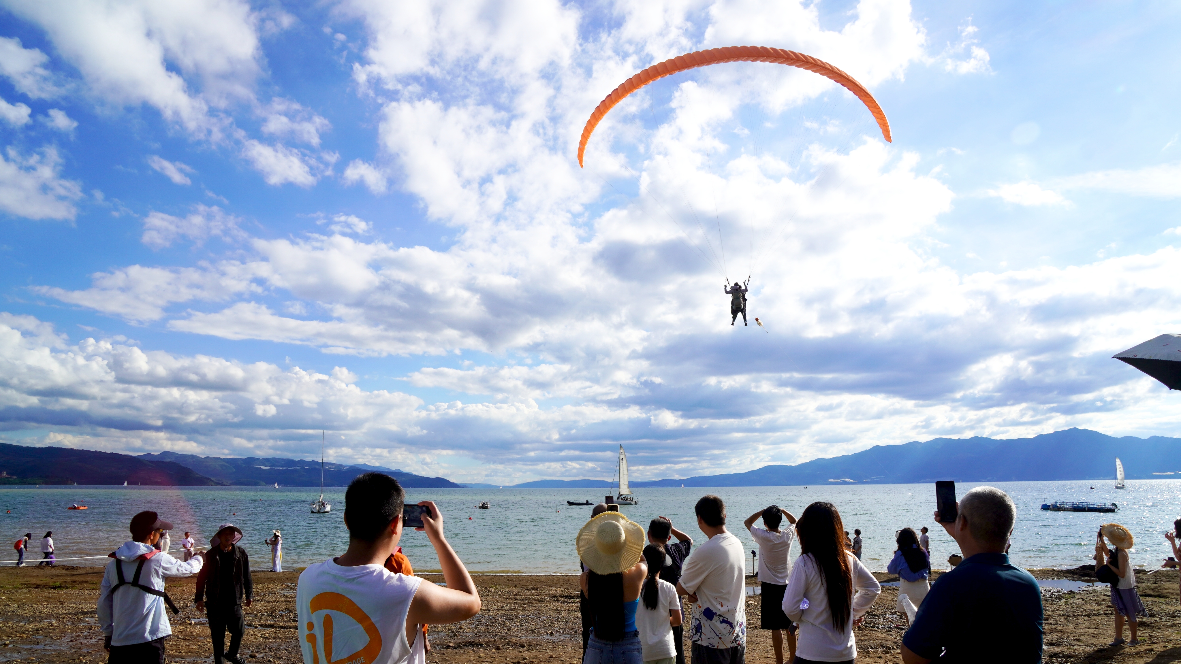 与直升机的“硬核”体验不同,抚仙湖月亮湾国际滑翔伞营地更添一份飘逸与浪漫。平缓的沙滩上,彩色的滑翔伞在风力作用下缓缓张开,像一只振翅欲飞的蝴蝶。教练带着游客奔跑一段距离后,伞翼便腾空而起,稳稳朝湖面飞去。