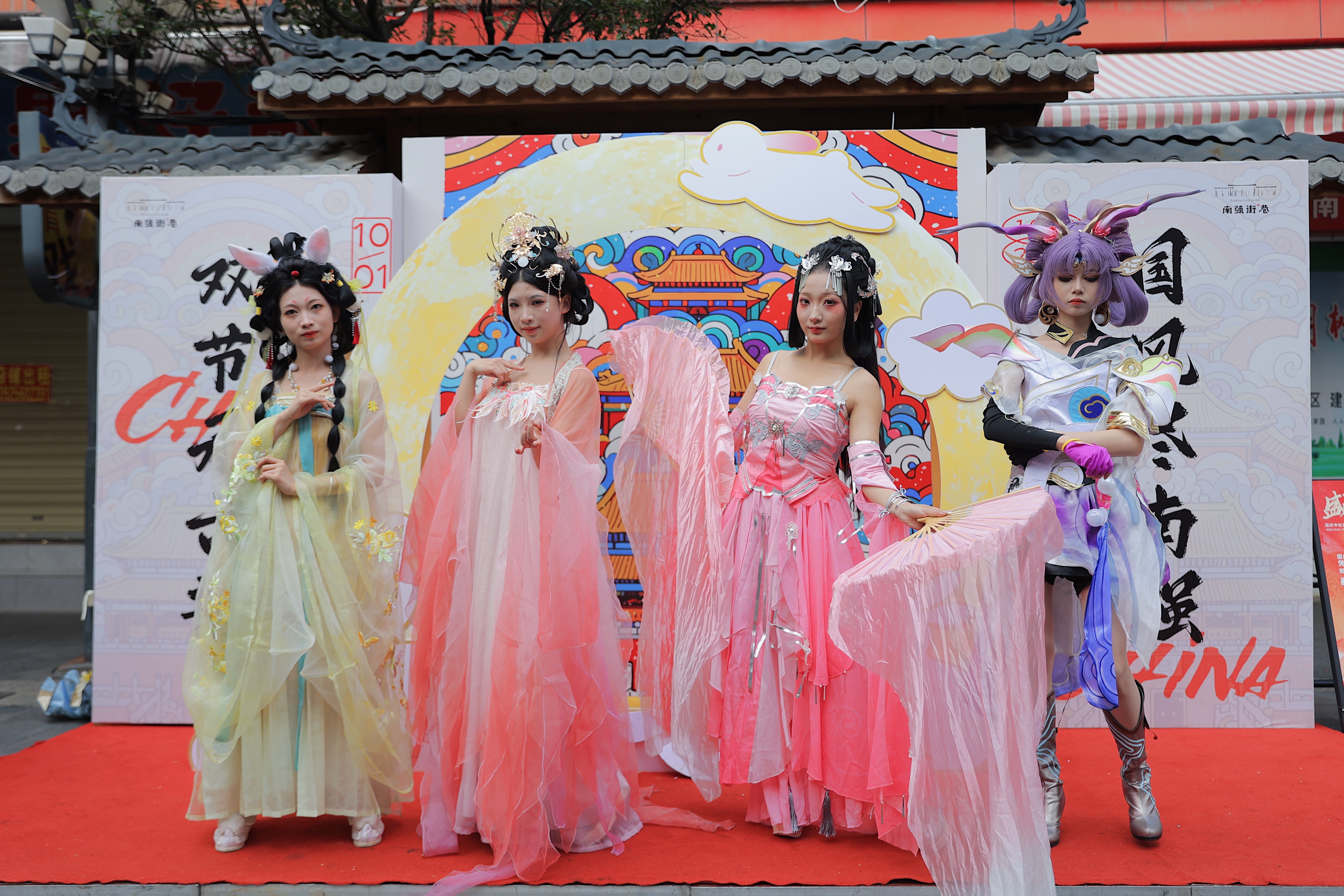 在南强街巷的历史肌理间,双节游园会贯穿全程:街区沿老建筑脉络设置多个国风美陈互动打卡点与趣味游戏区域,灯笼缀满骑楼檐角,与青砖灰瓦相映成趣。市民游客漫步其间,既能触摸老昆明的商贸记忆,又能通过参与游园活动收获南强街巷定制的精美礼品,实现“一步一景,一玩一礼”的沉浸体验。每日定点开展的汉服巡游与互动秀是活动核心亮点——身着曲裾、襦裙的表演者穿梭于街巷,与八十八号庭院剧场的古朴院门形成时空对话,仿佛将老昆明的烟火古韵与传统服饰文化一同“唤醒”,吸引众多游客驻足合影,感受“人在景中走,如在画中游”的国风意境。