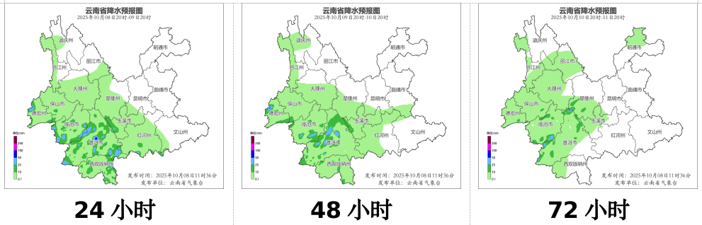 10月10日20时到10月11日20时:德宏州、保山市、大理州、怒江州、丽江市、楚雄州南部、玉溪市西部、临沧市、普洱市西部和北部、西双版纳州西部、昭通市北部多云有阵雨局部中雨、大雨,其他地区晴间多云。