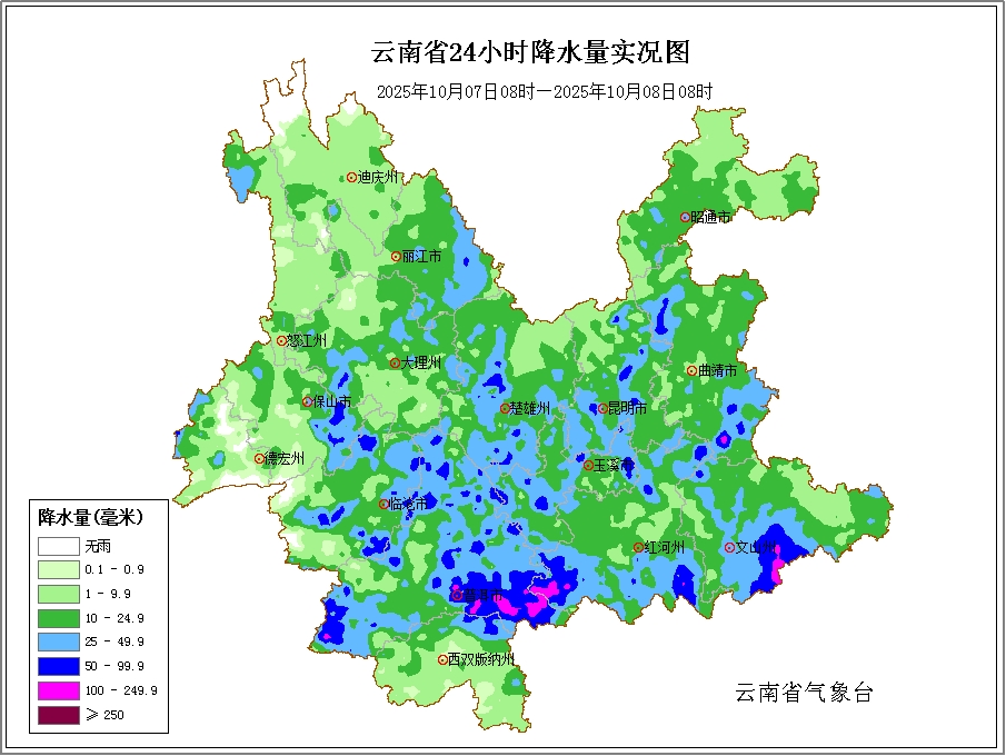 10月7日,文山州南部、曲靖市南部、红河州南部、普洱市南部降大到暴雨局部大暴雨,文山州北部、曲靖市北部、昆明市东部和南部、玉溪市、普洱市北部、西双版纳州东部、临沧市东部、德宏州西部、保山市东部、怒江州北部、大理州南部、丽江市东部、楚雄州南部降大雨局部暴雨,其他地区降小雨局部中雨。