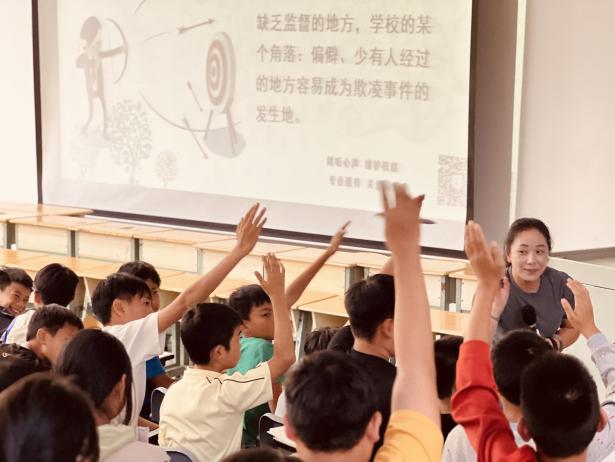 讲座尾声,杨清婷抛出问题——“欺凌行为违法吗?”引发了同学们的激烈讨论。结合大家的发言,杨清婷分享了自己的经历,帮助同学们全面认识欺凌的影响进而提升同学们的法治观念。
