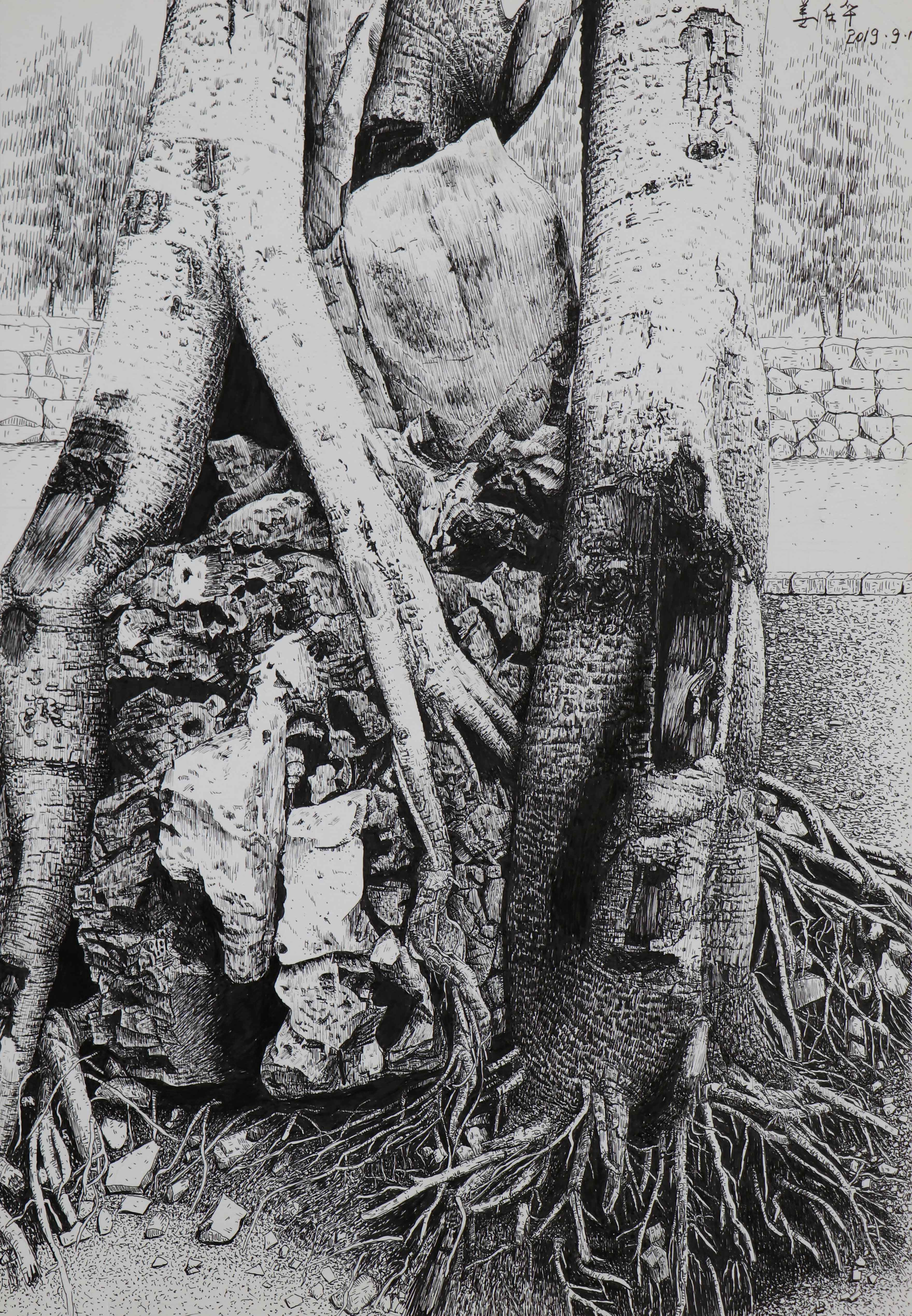 钢笔画的魅力,在于其独特的黑白对比和线条变化。黑白两色,至简至丰。在这些描绘会泽古城的作品中,作者通过精准的黑白布局,营造出强烈的视觉冲击力。线条的变化也是姜仕华钢笔画作品的一大亮点。粗线条用于勾勒建筑的轮廓和主要结构,给人以坚实、稳重的感觉;细线条则用于刻画细节,如砖瓦的纹理、树叶的脉络等,展现出细腻与精致。不同线条密度的巧妙排列,更是让画面呈现出丰富的层次感和立体感。