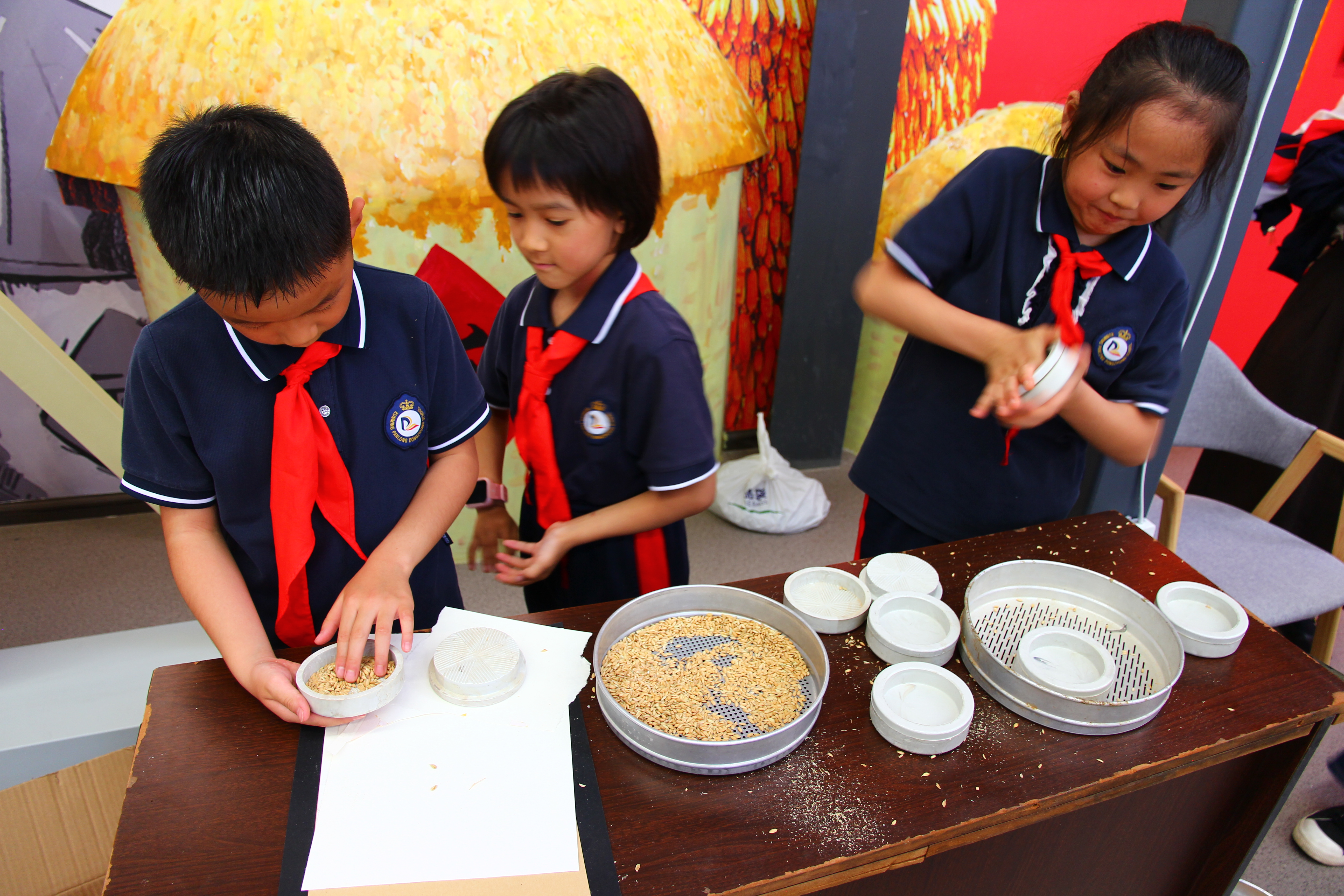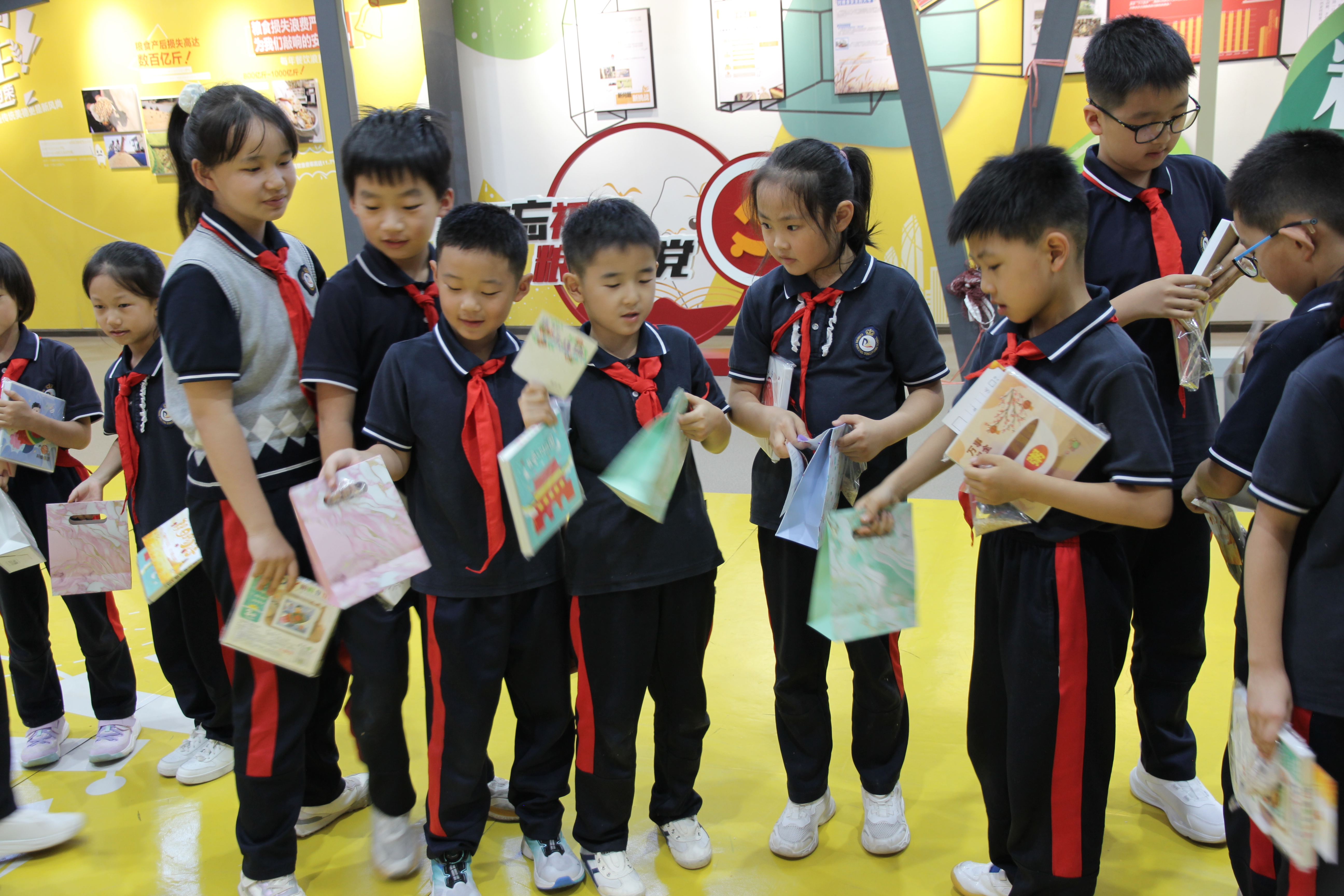 在粮食文化展区,五年级队员以“老带新”方式带领二年级队员齐声诵读《悯农》,传递“节约光荣、浪费可耻”的理念。高年级队员还亲手制作贺卡与礼物赠予低年级同学。