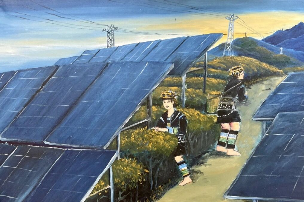 整个展览分为哈尼篇与布朗篇两个单元,以艺术形式呈现传统能源智慧与现代可再生能源的融合共生。在哈尼篇“以翅换火——跨越千年的哈尼族能量之源”中,哈尼阿卡文化传承人、民间画师先甲带来《哈尼族传统村落布局图》《传统山地农耕图》等作品,生动展现火塘在哈尼族社会生活中的核心角色。画作不仅描绘了梯田农耕中对生物质能源的循环使用,也呈现了今天村寨中逐渐普及的太阳能光伏设施,反映出一个民族在文化传承与绿色转型之间的积极探索。