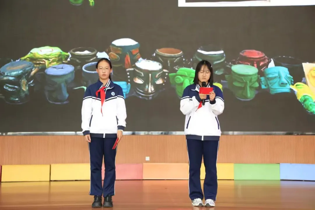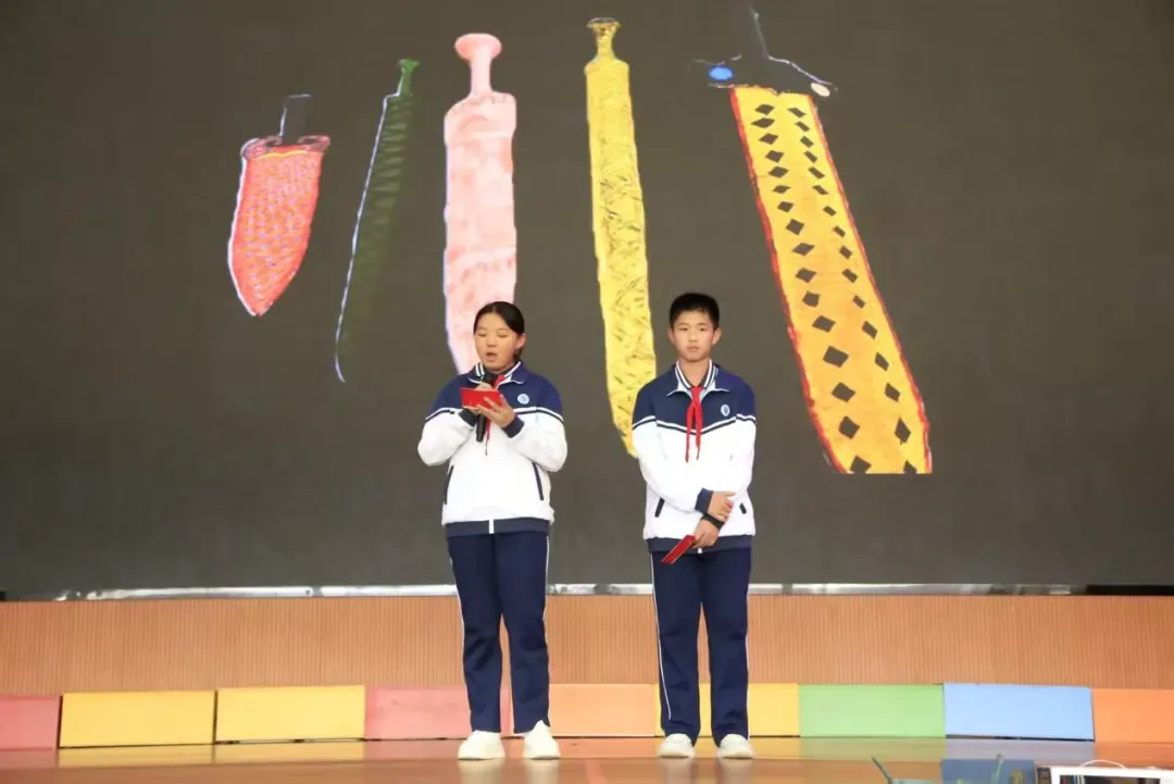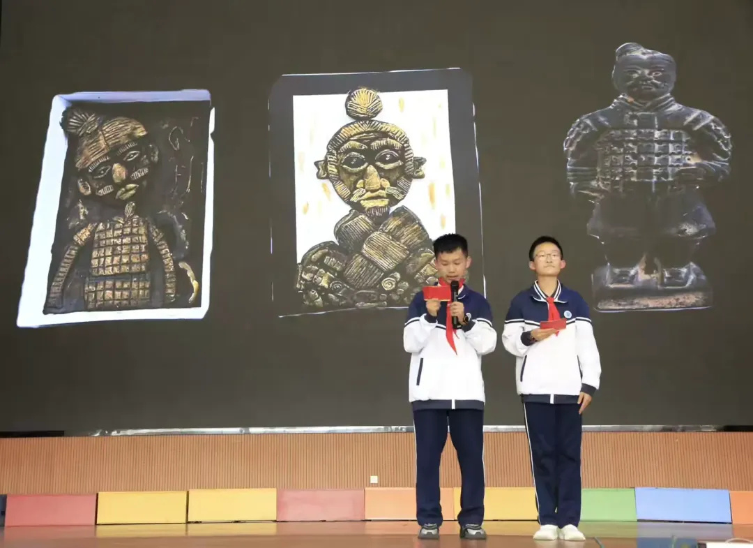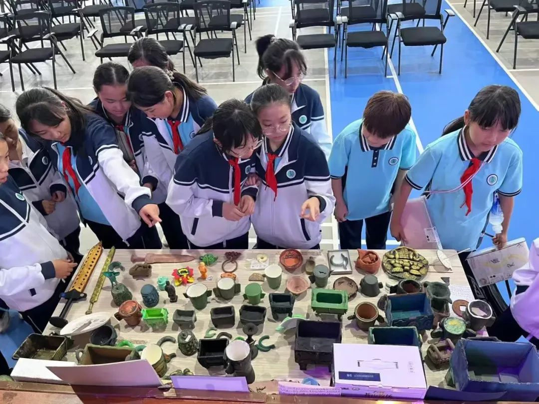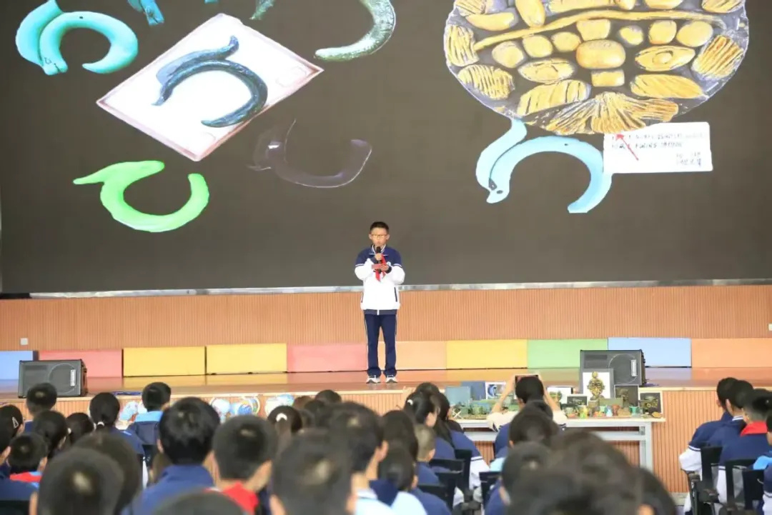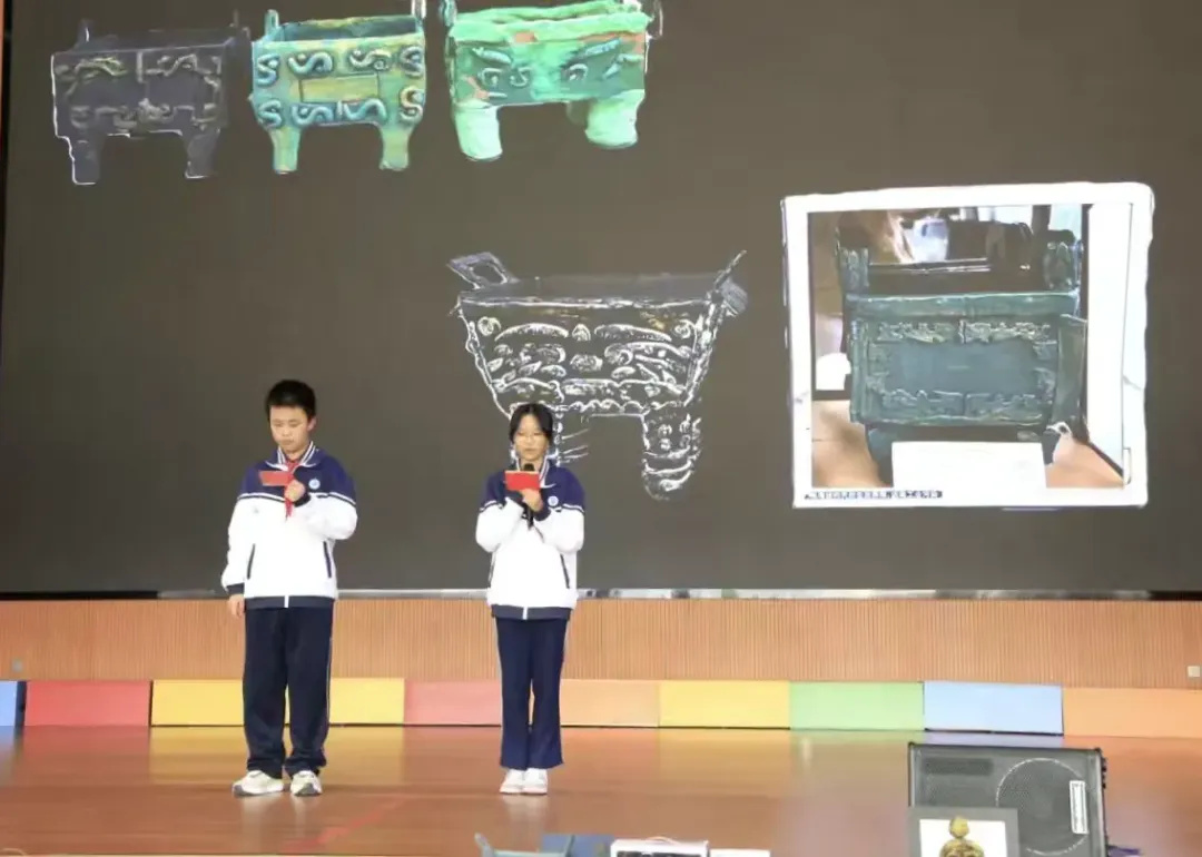 完成复刻后,学生们纷纷化身“文物讲解员”,自信地站到台前。他们讲述着手中“国宝”背后的朝代故事与文明脉络。分享与抢答环节气氛热烈,从红山文化玉器到越王勾践剑,再到青铜面具,同学们用稚嫩却专业的语言,将一段段尘封的历史娓娓道来。