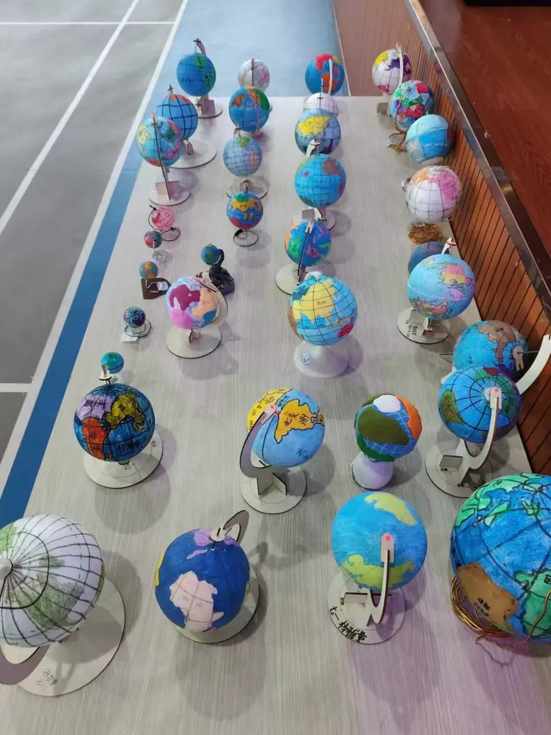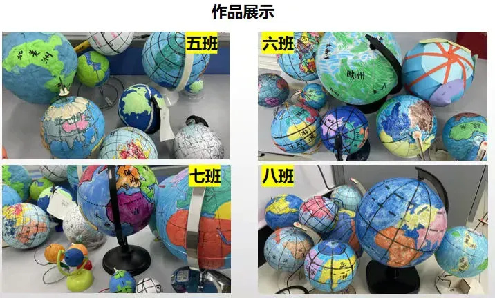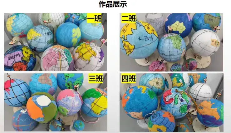 经过筛选的优秀地球仪作品随后亮相。这些作品各具特色:有的精准还原了经纬度网络,有的巧妙融入了世界地貌特征,还有的别出心裁,使用环保材料制作,传递着绿色理念。周老师带领大家围绕作品的美观性与精准度进行互动交流,同学们踊跃分享自己的创作思路。